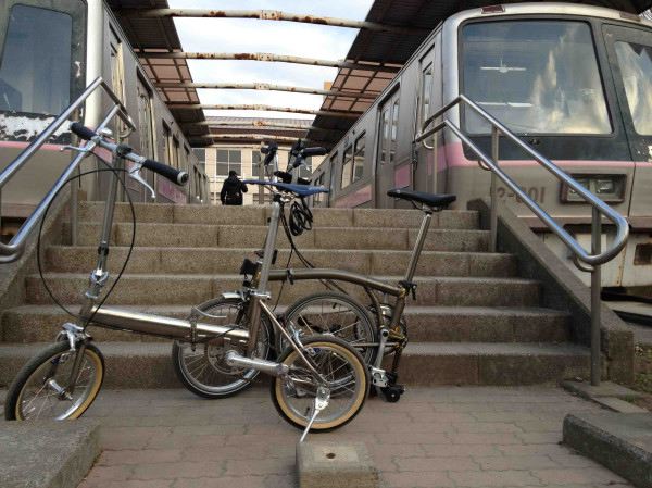 輪行はこんな感じで。折たたんで電車乗って、広げて走って、撮影して、走って、また折りたたんで電車乗って移動、の繰り返しです。車内では、