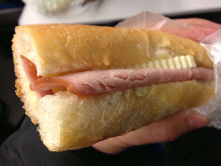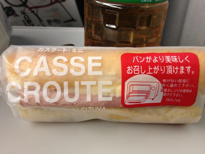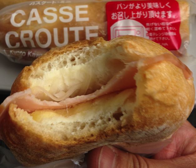 柔らかいフランスパンみたいな感じのパンに、タマネギとボンレスハムとマーガリンだけなのに、超うみゃ〜!こ、これは凄い!たぶんしみこんだマーガリンが隠し味で効いてますな。
