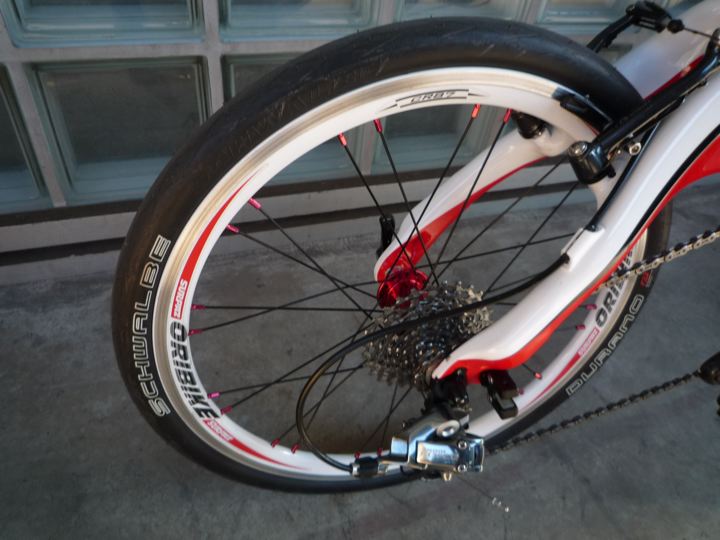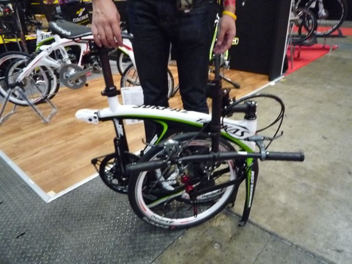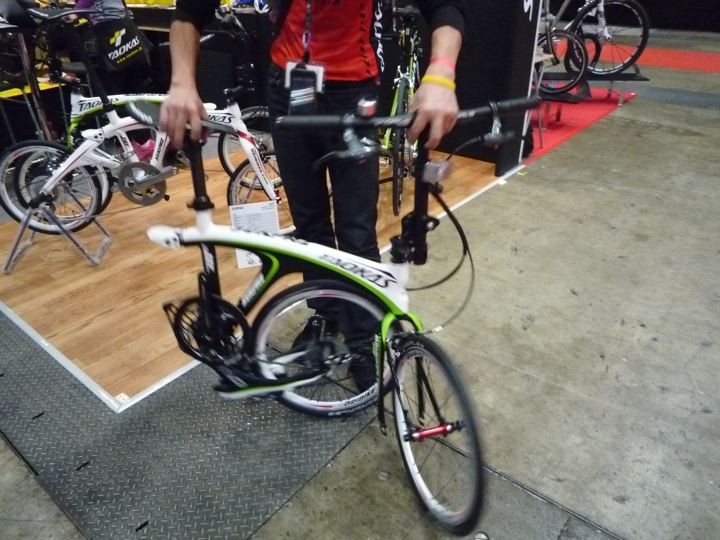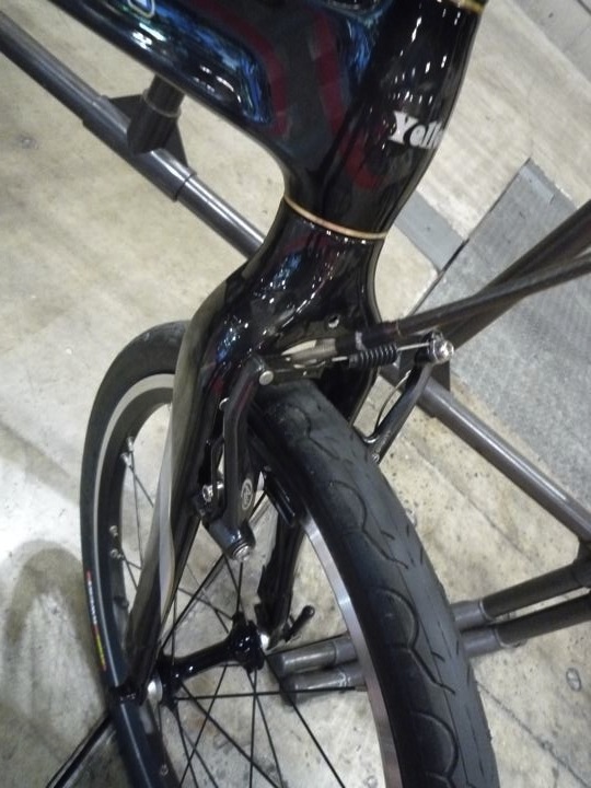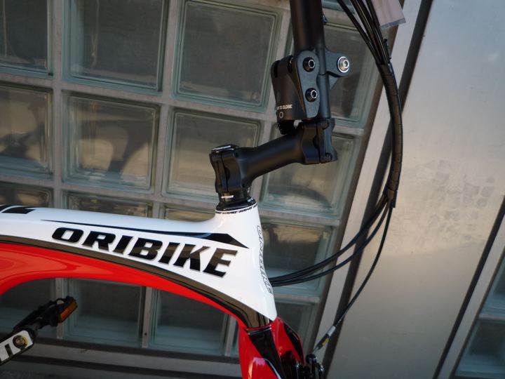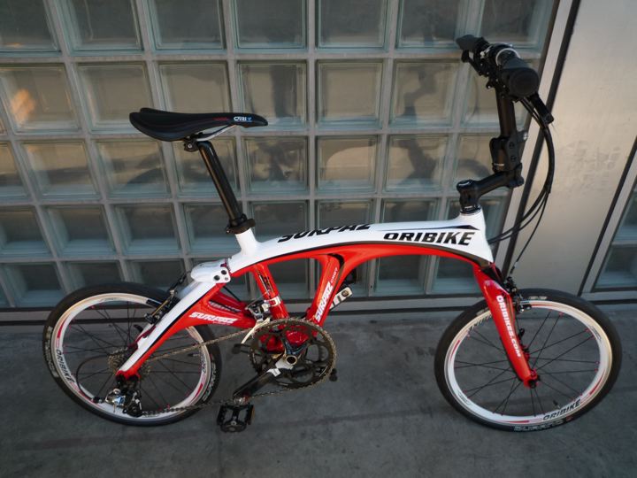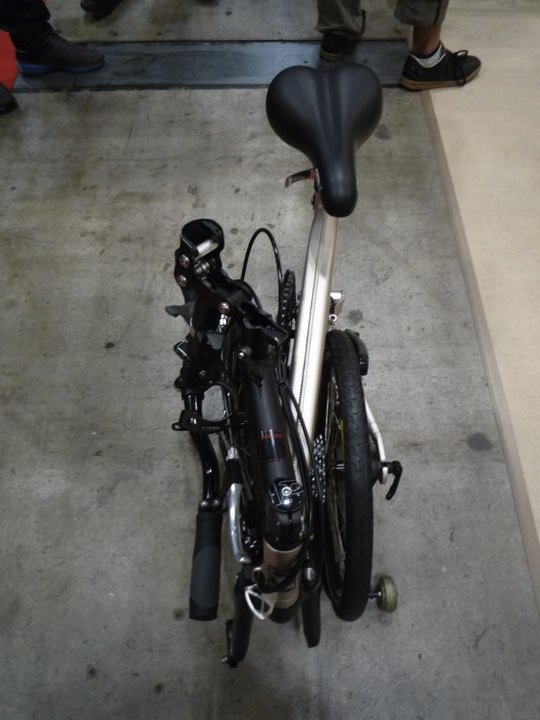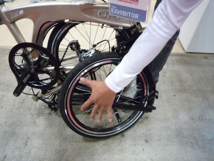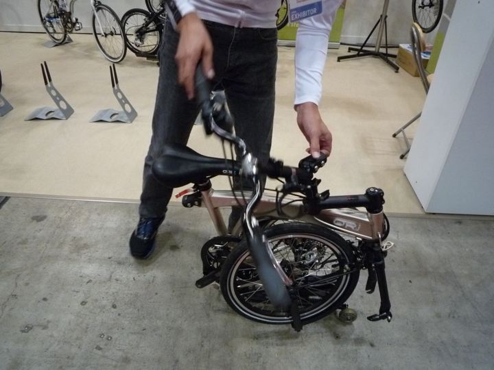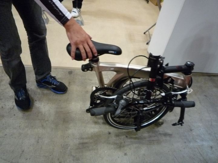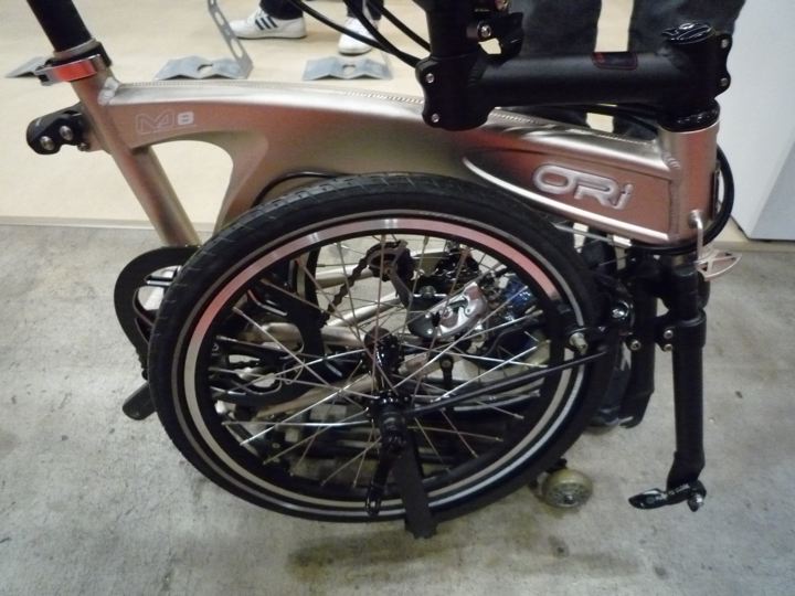 頑張ってるのに何故か、なかなかメジャー化しないORiBIKEにもう一度試乗。ORiBIKEはイギリス人の元F1ドライバー、のちに優秀なデザイナー兼エンジニアになったジョン・ホワイトによって設計されたBromptonとbd−1の中間みたいな折りたたみ自転車なのです。ORIとは日本の折り紙からきているとの事。航空機の安全ベルトからヒントを得たインスタント・リバウンドキャッチなるセーフロッキングシステムにより素早く簡単にロック。折れ曲がったステムがなんとなく視覚的に不安定に見えてしまうのは残念だが、そのステムを180度回転させ、不思議な2つあるフロントフォークをリリースして前輪を畳み、後輪の折り方はBroとbdと同じ。メインフレームを折らないのはbdと同じで剛性高しって事みたいです。折りたたんだサイズも丁度Broとbdの中間。Bromptonとbd−1では物足りない、あまり見かけない、人と違ったのに乗りたい方にはうってつけの折りたたみ自転車と言えるでしょう。
