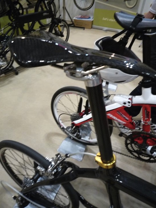 カーボンサドルやチタンスポークでお世話になっている謎の創業90年の金澤輪業さんへ。どうせならば試乗はフルカーボンのSURPAZ CR87から。去年もそうだったか・・・
