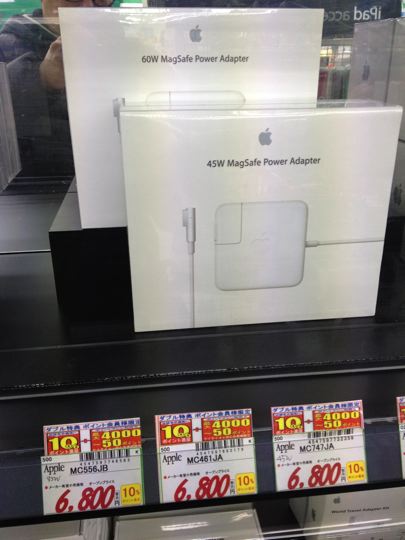 昔のPowerBook用と違って、マグセーフになったからもう絶対に壊れないだろうと思っていたミスター用MacBookAirのACアダプターが壊れたとゆ〜事で、新橋のヤマダ電機さんで購入。相変わらず、た、たっけ〜なぁ〜!マグセーフ部分は問題ないのですが、ケーブルがよじれて断線した模様。どうゆ〜使い方したらこれが壊れるのでしょうか?不思議です。