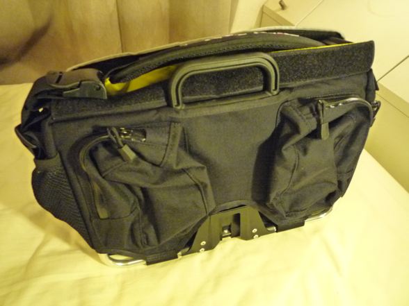 キャラダイスのバッグを安売りで購入したのですが、フォールディングバスケットについてたフレームのサイズがあわなかったので「フロントキャリアフレーム S-Bag用」なるフレームだけを買おうかと思いましたが7500円もするのでアホらしくなり、S-Bagごと購入を決定。バッグの世界にはこれ以上ハマりたくなかったので、初期段階で「安物買いの銭失い」を阻止したのであ〜る。純正S-Bagはこれです。