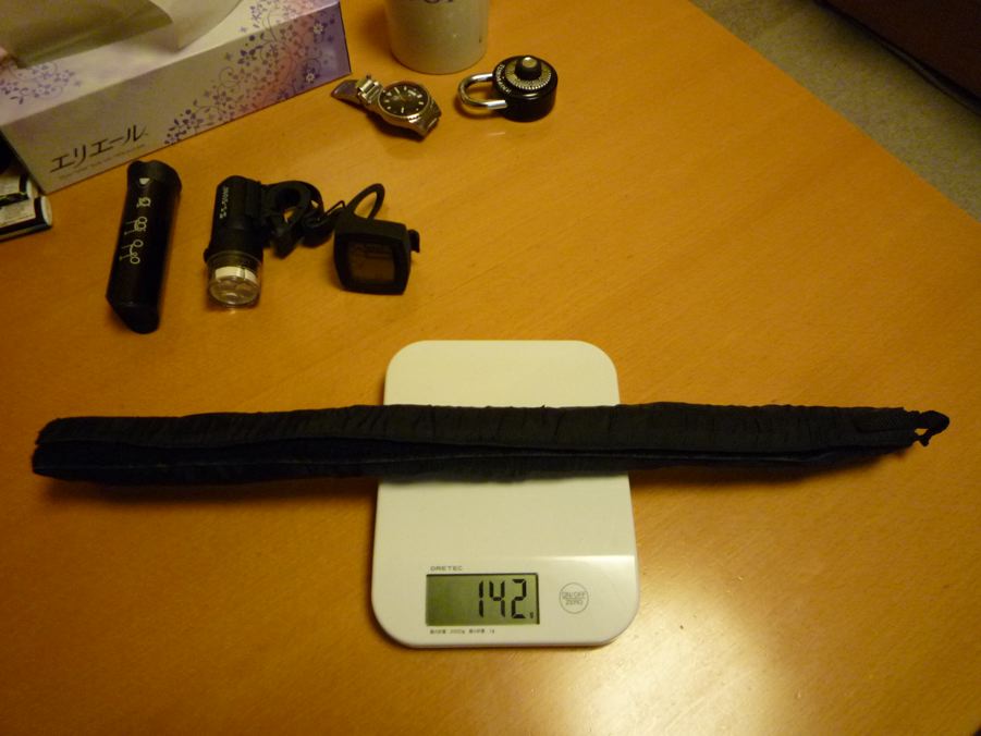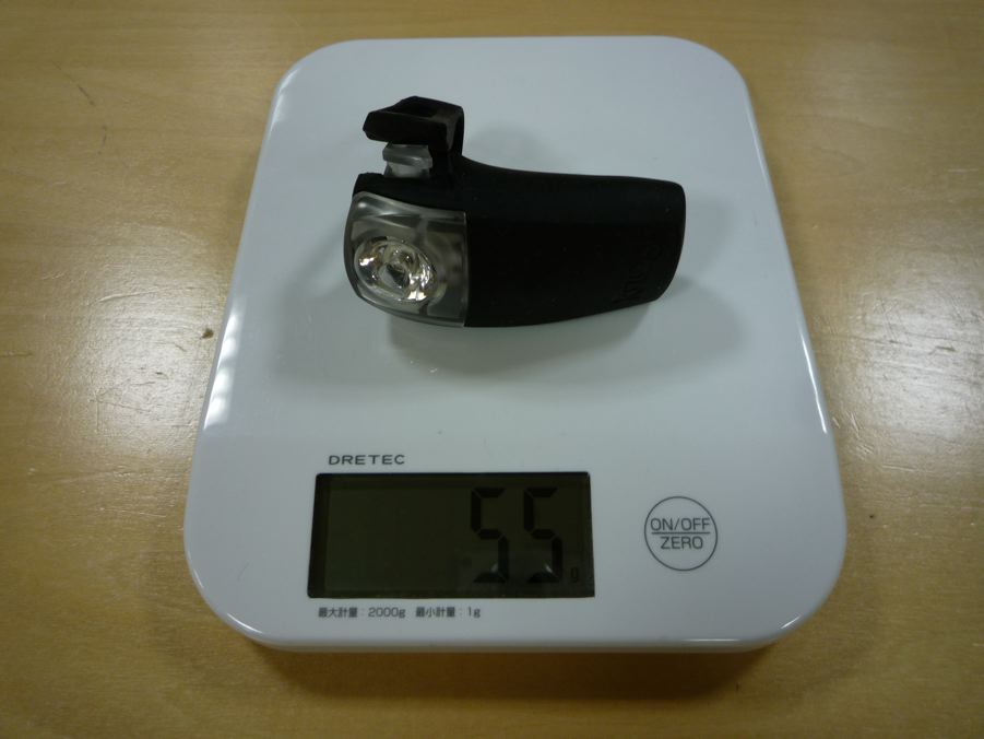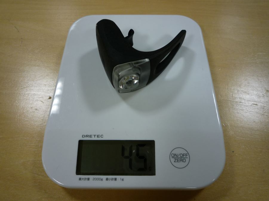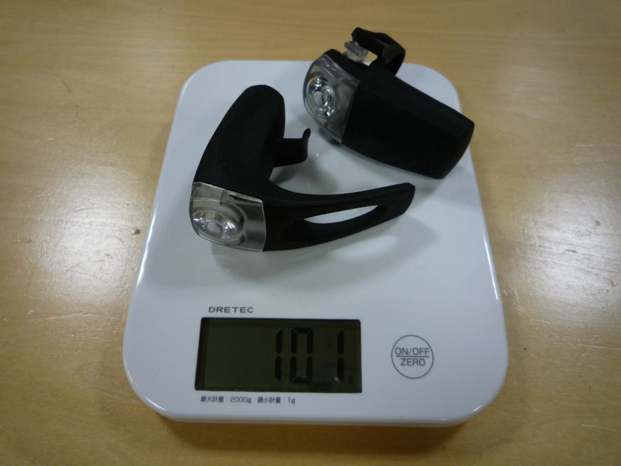 ノグライト!フロントは45g!リアは55g!合計で101g!軽いしそこそこ明るいし昼間は台座もなくて簡単にはずせて便利!