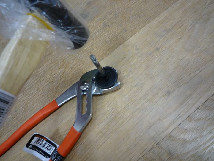 ここにある工具だけで気転を利かせて、こんな方法で、叩いて抜けた!
