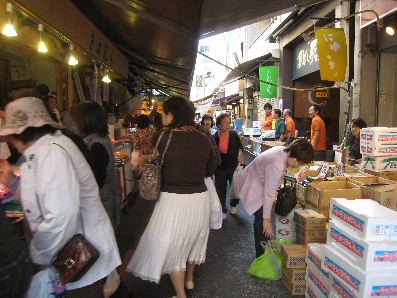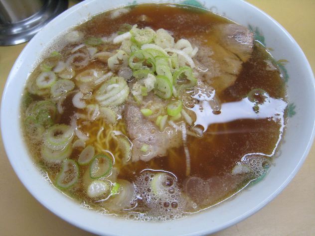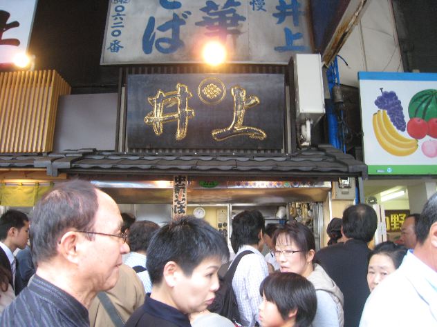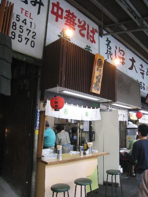 なんとなく物足りなさを感じ、行列で賑わう「井上」さんを通過し、中華そば「若葉」さんへ。仲睦まじいご夫婦が丁寧にラーメンを作ってくれます。噂によるとここのチャーシューはJALの機内食に出しているところと同じものらしいです。空いてるだけにすぐに出来上がります。麺はせっかちな市場の江戸っ子の為に、すぐに茹で上がる様に極細麺(長浜ラーメンと同じ理屈ですね)そしてけして飽きる事のないあっさり醤油味と噂のチャーシューもGOODです。ネギが全体の美味さを更に引き立てます。僕の場合は少しパンチを効かせる為に胡椒とラー油をいつも多めにどばっといきます。シンプルなだけにこの美味さは本物と言えるでしょう。