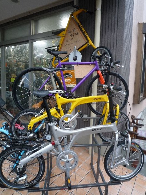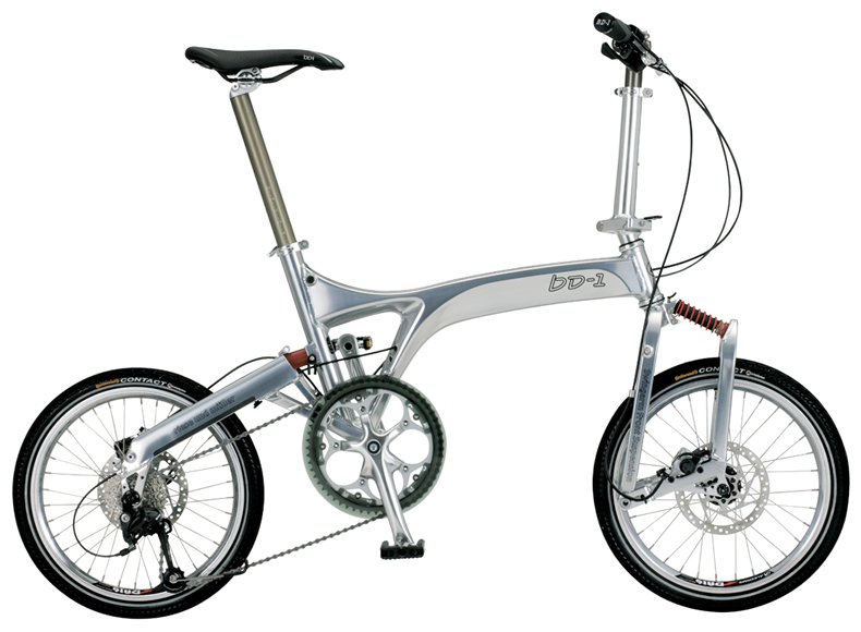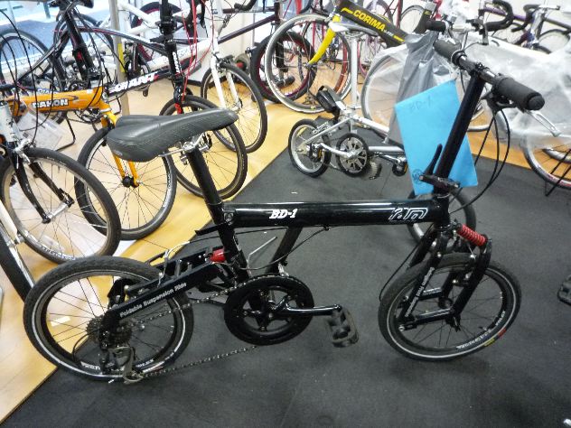 自転車にハマっているといっても、スポーツバイクやMTBほど本格的なものではなく、僕の場合は、ただひたすら小型軽量で実用的な自転車に限定しているわけなんです。時代と共に、ミニベロ、フォールディングバイク、小径車、スモールバイク、折りたたみ自転車。いろんな呼び方があるそれらに分類される自転車がいいわけです。で、ゼロ年代初頭までさかのぼり、古本雑誌を買いまくって調査した結果、不滅の2大勢力を発見した次第です。(アレックス・モールトンだけは歴史も価格も別格なのでここでは割愛します)ひとつはブロンプトン。そして今回のBD-1なのだ。最初見た時はちょっとメカニカル過ぎるデザインかな?が、試乗して吹っ飛びました!いささかハンドリングにはくせがありますが、やっぱ速いのは気持ちいいです。折りたたみ機構もなんともえぐい折れ方をするので感動しました。この1台から、サスペンションとディスクブレーキにハマってしまったのでした。どうせなら最高級モデルのチョイスで、BD-1 Speed Disk ハイポリッシュ!タイヤは18インチ、重さ11.6kg、外装9段変速、折りたたみは20~30秒?最安値で¥173,900(税込)いかがですか?このシルエット!