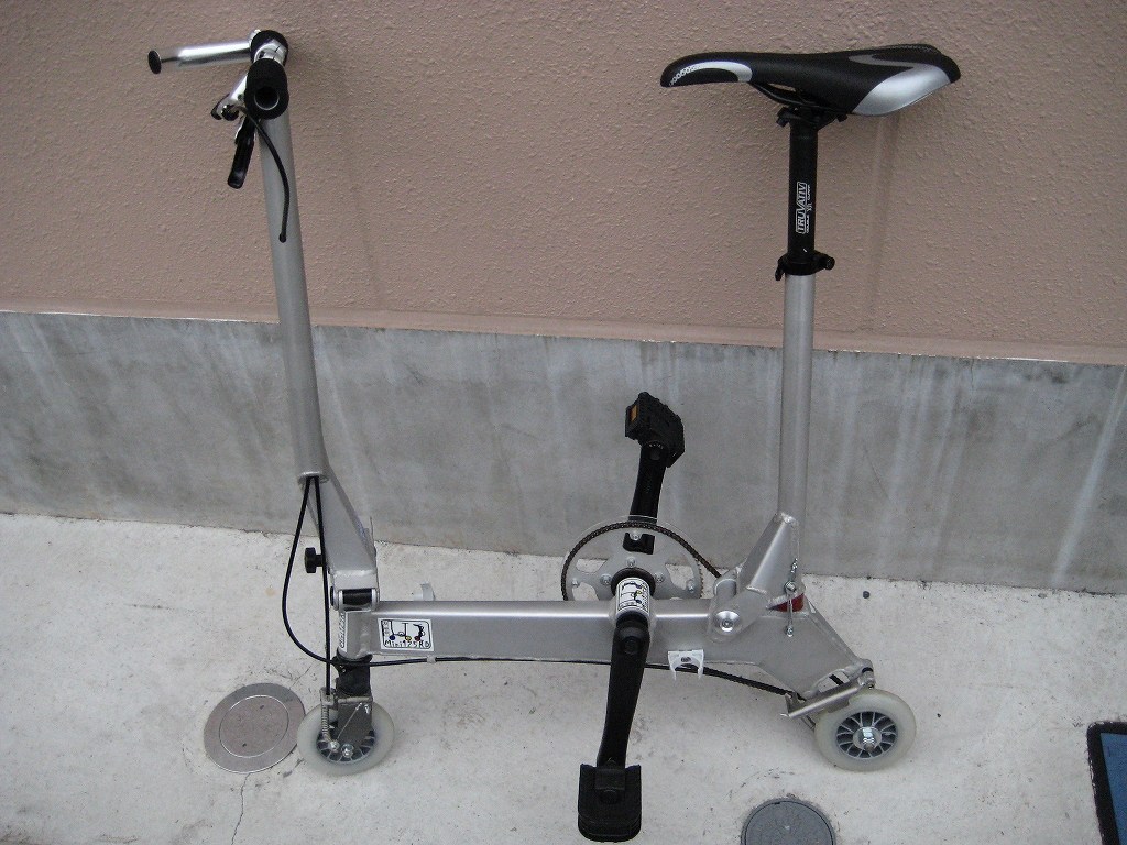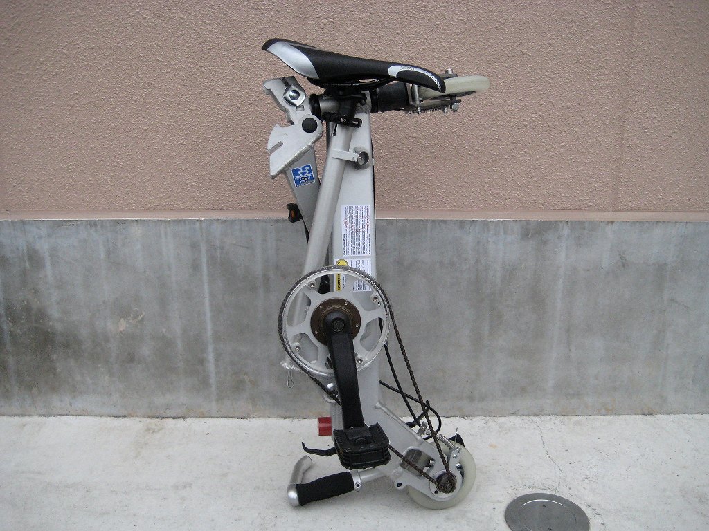 アルミシルバーでなんと重さ5.9kg!とゆ〜事はA-bikeより軽い!ホイールサイズは2種類あって110mm/125mmタイヤに空気が入ってないから、ゴリゴリかも。でもパンクの心配はなし!ギヤ比が凄くて84T x 8T!通常サイズ:1000x750x320mm、折畳サイズ:730x310x220mmで、価格もびっくりの103,950円!妙にアンバランスなデザインですが、これほし〜!