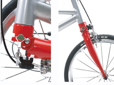 フレームはアルミ、カドワキ製パウダーコーティングってのは、要するに粉体塗装、赤いフォールディングフォークはなんとカーボン製!、タイヤサイズは20インチ、外装9段変速、重さ8.99.4kg、折畳サイズW870×H798×D350、色は、ブラック・ホワイト・プラチナシルバー×レッド・イエロー・オレンジ・ブルー(限定)