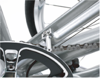 BB周りの剛性を確保するために、BB下のにベアリング内蔵のピポットを設計。これを回転軸に、リアホイールが、180°展開。その際、折畳み時のチェーン脱落を考慮し、56T・CNC製のチェーンガードを装着。標準仕様は、53Tのシングルチェーンリング、ホローテック方式のクランク・BBの採用。