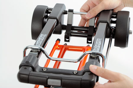 このしなやかな走りを生み出すフレームは、QR固定の前後ホイールを取りはずし、リアサスペンションの後方QRをゆるめることで、工具等を一切使う事無く、分解して、コンパクトに折畳む事が可能です。折畳んだ際の厚みが、薄いことも特徴です。
