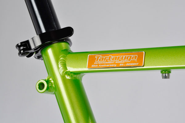 Type F発売開始時に、ラインナップにあったフレームカラー「グリーン」を、2010年風にアレンジして復刻し、全てのケーブルに、同じく最初期から最新モデルまでラインナップにもありコーポレートカラーでもある「オレンジ」をイメージしたケーブルワークを施し、 アルミ削り出しの、特製「Tartaruga 10th Anniversary」メモリアルプレートには、クリアーオレンジのアノダイズ処理を施し、カラーレーザー刻印によるシリアルナンバーを刻印、立体的な縁取りに再度マシニング加工を行い、アノダイズカラーとアルミ素材のコントラストを生かしてあるそうです。 その他、細部ディテールにも、デザインスタジオであるタルタルーガ・エンターテイメントワークスならではのこだわりが。 更に更に、このプレートはデザイナー吉松さんが自ら10年間の感謝を込めて一枚一枚フレームに取付けたとの事です!