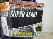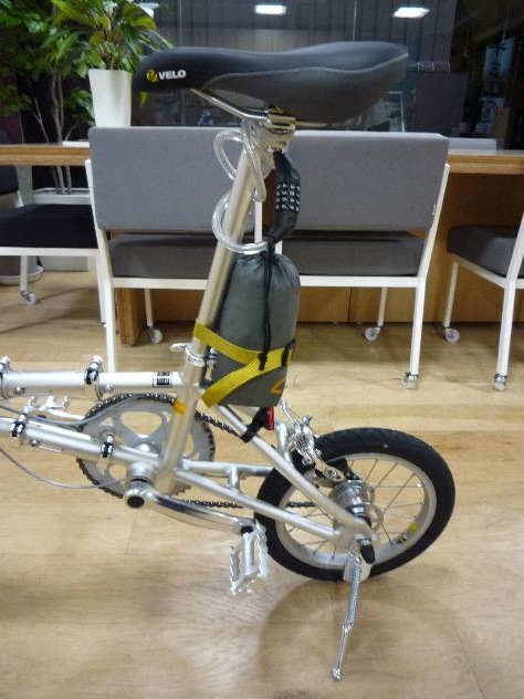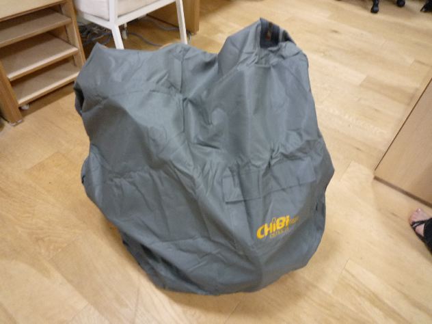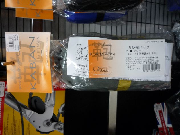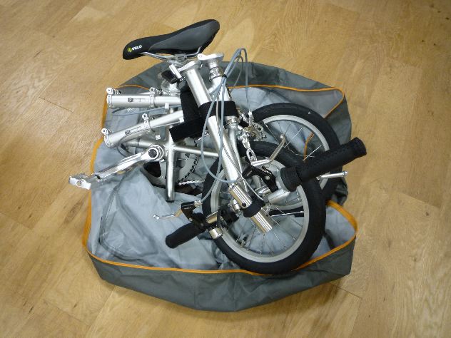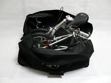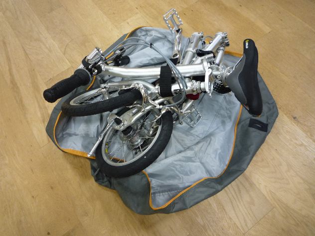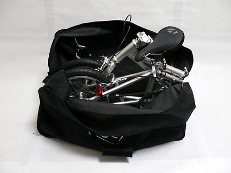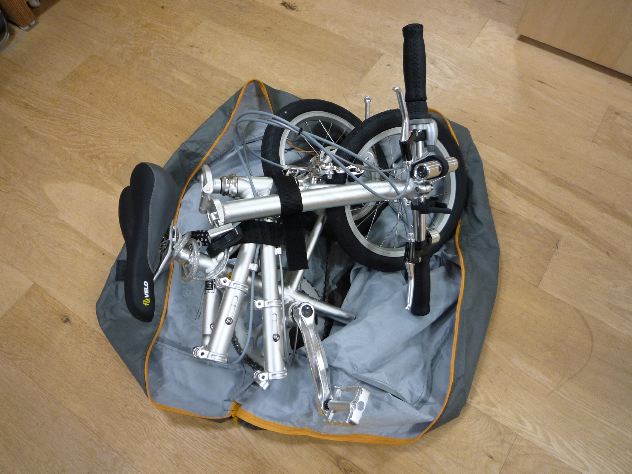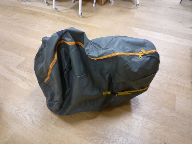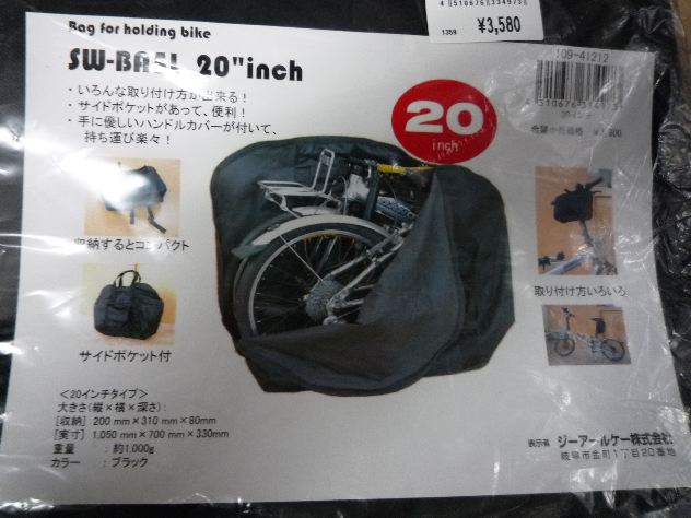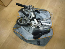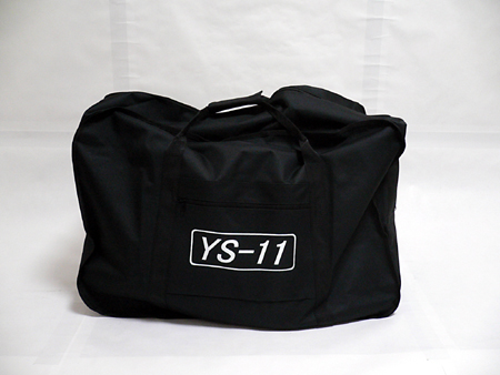 そうなんです!折り畳んでバッグにしまって電車で移動、着いたら駅で出して広げて自転車に乗る。帰りは駅で畳んでまたバッグにしまって電車で帰る。もしくは、走れる所まで自転車で走って疲れたら帰りは折り畳んでバッグにしまって電車で帰る。そう、いわゆる輪行なるものがしたかったんです!でもひ弱な僕がかつげる重さはせいぜい10kg以下、10kgといえば米袋を考えれば結構重い。そこで現実的に可能な自転車を探すと、A-Bikeで6kg、トレンクルで6.9kg、YS-11の一番軽いので7.3kgです。重さに加え価格と実際の走行性能まで考えると、YS-11GXの8.8kgになった訳です。なので、どっぺるくんの12.4kgは対象外なのです。そこでYS-11GX用に出来るだけギリギリに小さくて軽くて安い輪行バッグを探してみた訳です。まずはYSの純正バッグから。