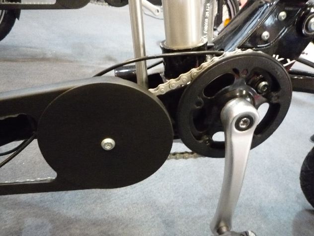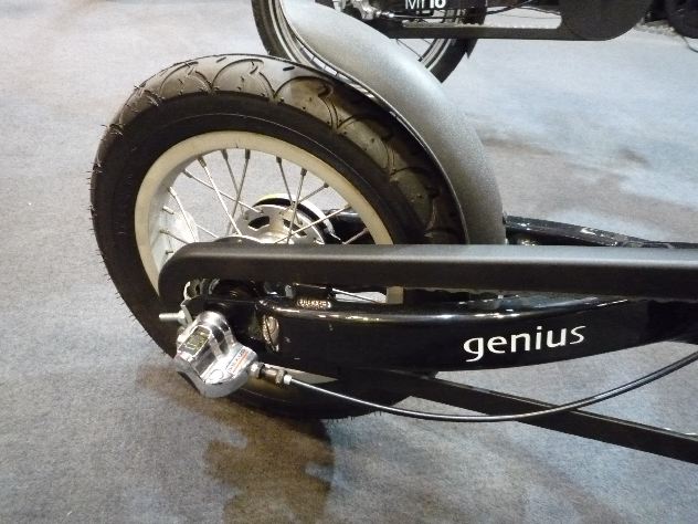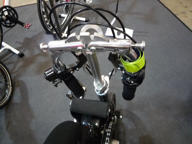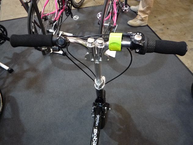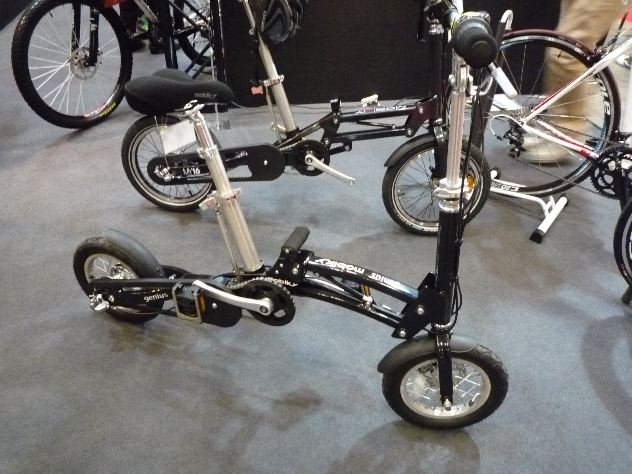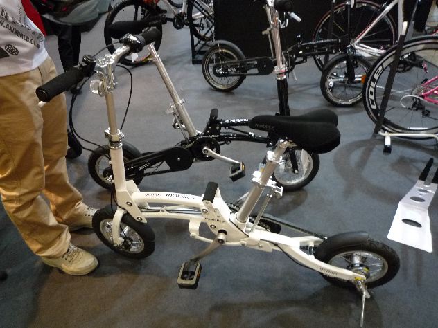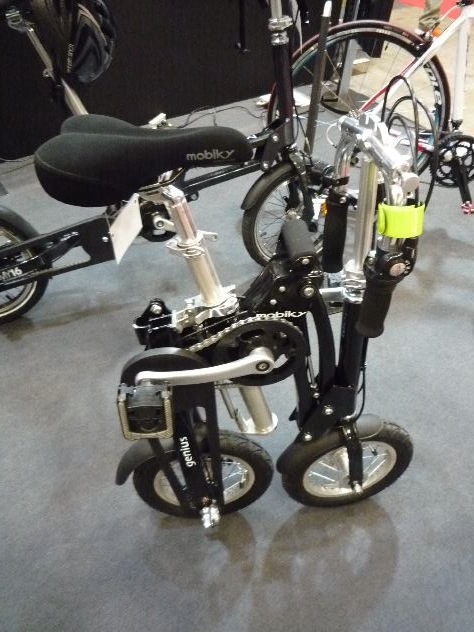 さて本題!そうなんです!かつて和田サイクルさんでつい現品を衝動買いしてしまいそうだったフランス生まれのMobiky geniusなのだ!あの時は試乗しませんでしたけど。ALLシルバーメタリックなメカニカルな固まりにグッときた記憶が。黒いやつで折りたたみ機構の説明を聞いてみました。なかなか気持ちよく折れますね。