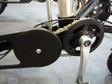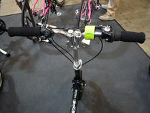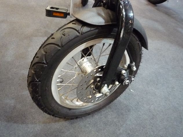 なぜかハンドルがかなりふらつく。せっかくダブルギアでそこそこ速度が出るのにハンドルがふらついて怖い!前輪のかわいいディスクブレーキは良く効く!我がとっぺるくんも前輪だけディスクブレーキなので、急ブレーキかけると逆ウイリー状態になるんで怖いんですが、重たい分低重心って感じで、どっしりしてて安定感あり。内装3段変速もスムーズ。やっぱハンドリングが問題点かな?折り畳み機構は良く出来てるがこの重さでは輪行は辛いかな?日常使いで折り畳んで玄関に立てておくって感じなんでしょうか?デザインはGOODだと思います。最後に試乗した白いやつ。