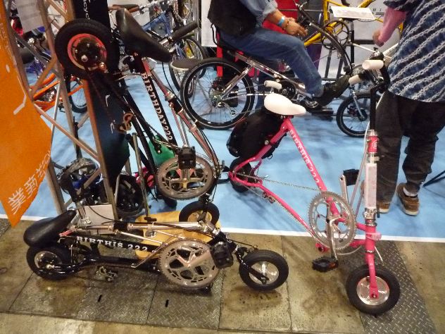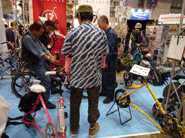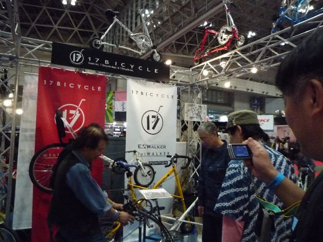 そうなんです!極小径車界(そんな業界はないでしょうけど)で有名な、あの17バイシクルさんの新型が登場なのです。もともとはディスプレイ業で展示会ブースの設計施工や看板サインなどの制作会社の様です。(そういえばそんな匂いがしてましたね)すでにエクスウォーカー、ミニウォーカーでおなじみですよね。僕も以前、本家本元のショールームに伺った際に思わずエクスウォーカーの限定車(紺メタ/外装2段変速)を速攻買いしそうになりました。このブログの過去記事をご参照ください。そんな17バイシクルさんが、8インチクラス最強の折り畳み自転車をめざして開発されたのがこの「バースィズ222」なのです!当初はバースデイ222(BIRTHDAY222)と呼ばれていましたが、他の自転車メーカーさんが商標権を持っていたらしく、急遽バースィズ222(BIRTHiS 222)に商品名が変更された訳です。それはさておき、17バイシクルさんのブースです。
