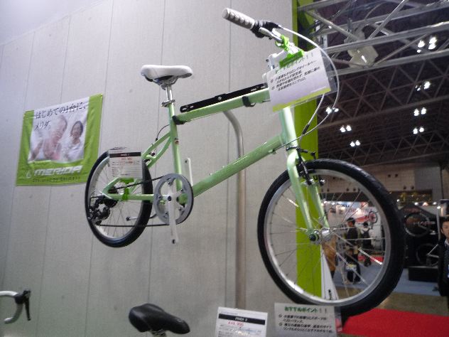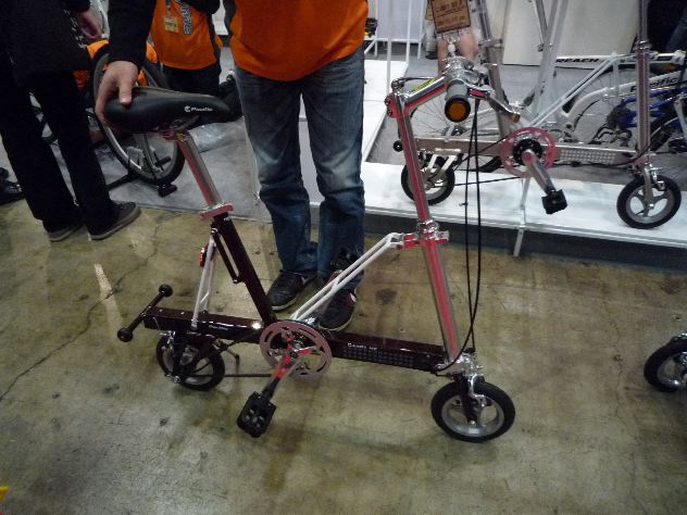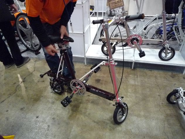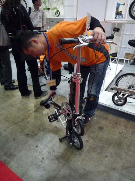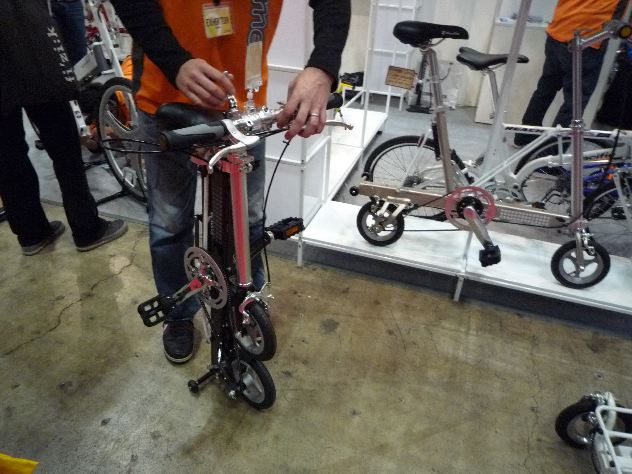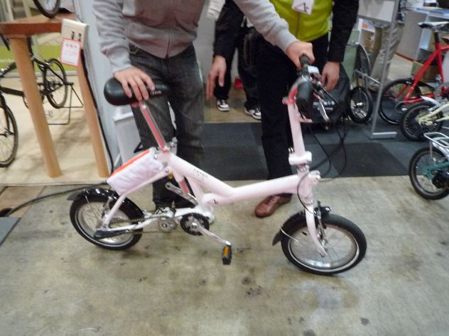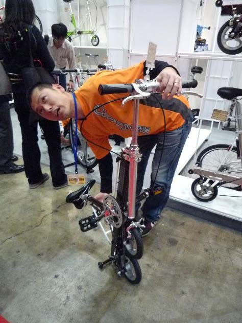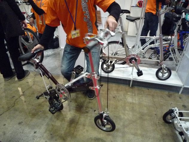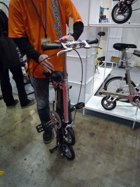 続いて、折りたたみ自転車界ではかなり実用的らしいキャリーミーです。これもなぜがデザインがあまり好きではないので折りたたみのデモのみ拝見して試乗はしませんでした。