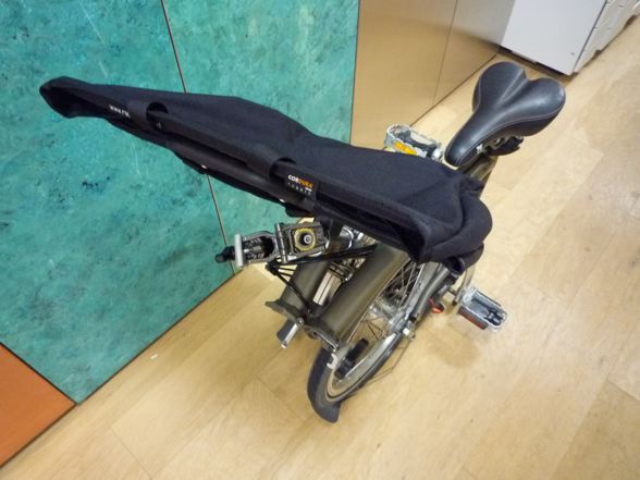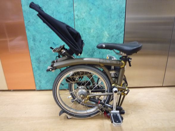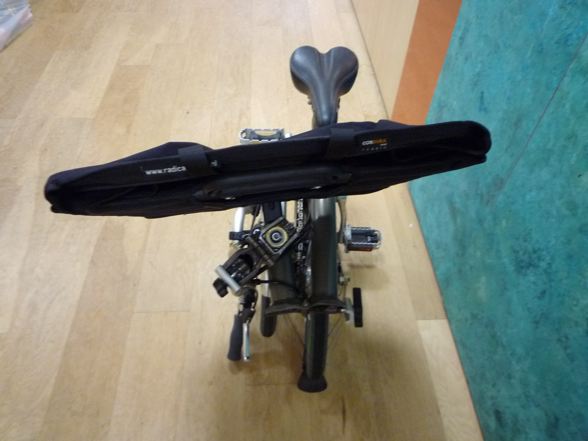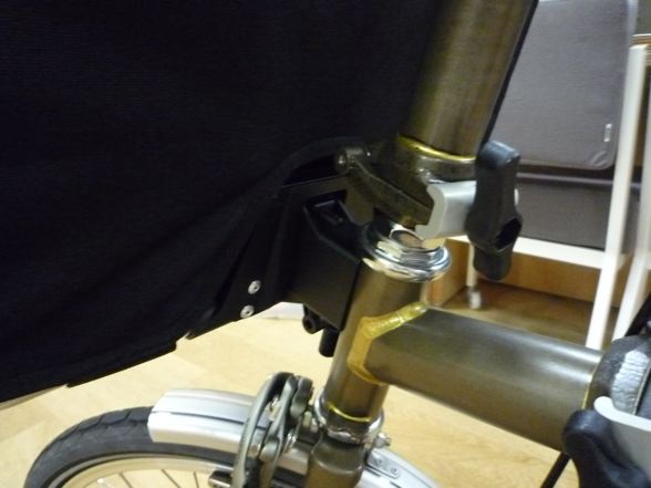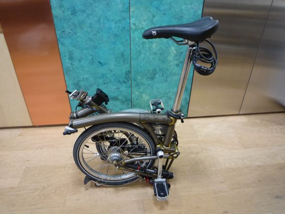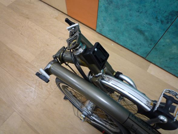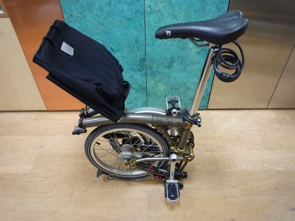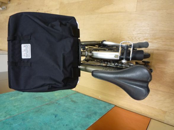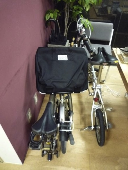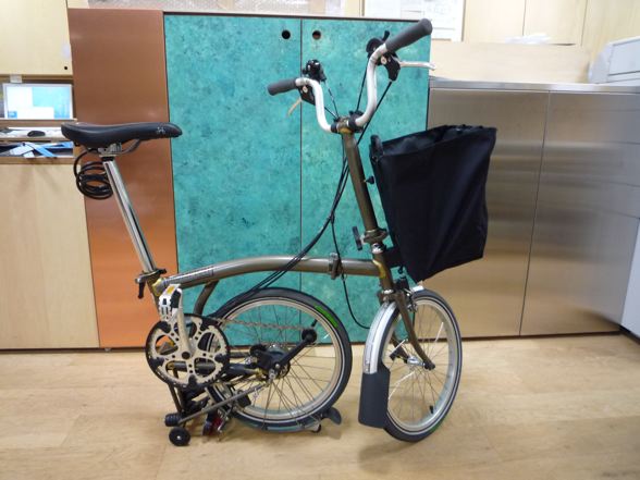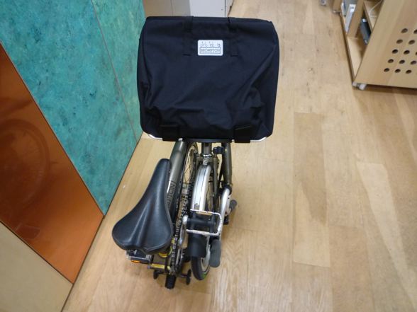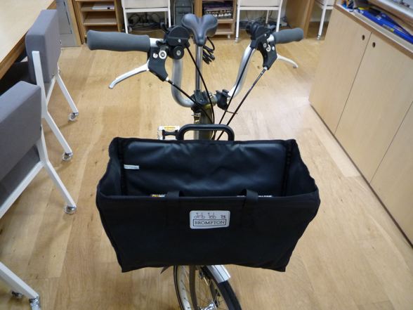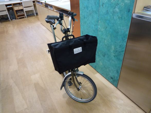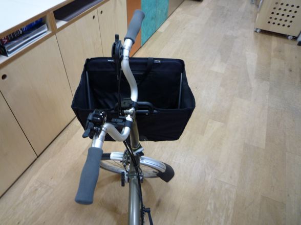 わかりますか?わからない方の為に解説しましょう。そうなんです!このBromptonオリジナルパーツの凄いところ。それは「カゴ」の取付位置が、ハンドルではなく本体フレーム側に付くので、重たい荷物を積んでもハンドルがふらつく事はないのです!ハンドル切っても「カゴ」だけは真っすぐでしょ!ね〜っ!うひょひょ〜!