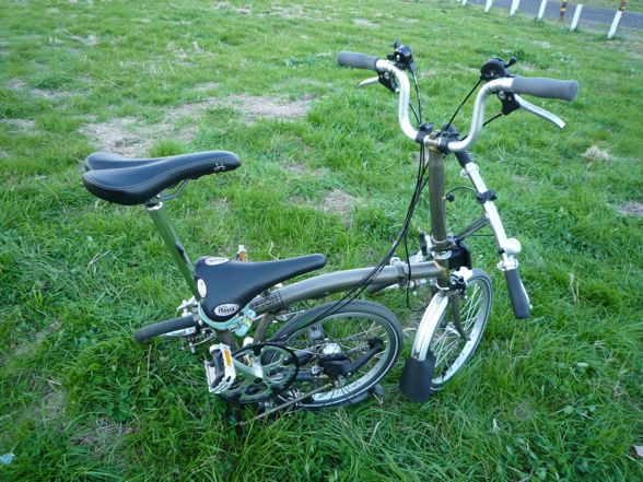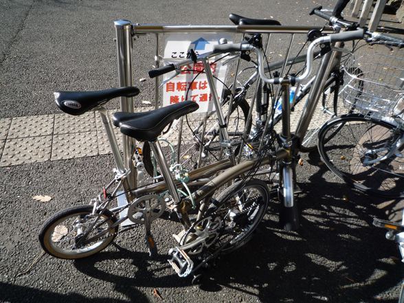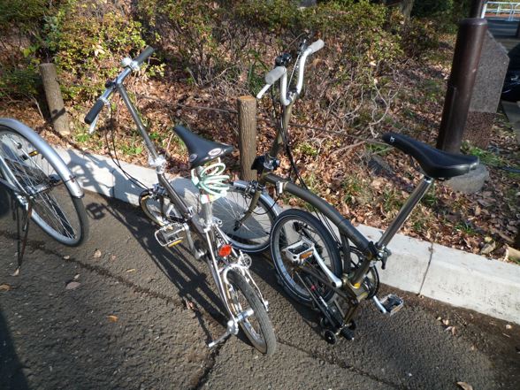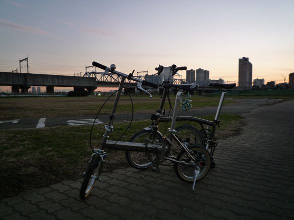 で、折りたたみ自転車対決ですが、当然折りたたみと展開はブロの勝ち。輪行中の担ぎ上げ重量は当然トレンクルの勝ち。走行性能は、意外とどっこいどっこいでした。(ミスターの若さもあるとは思いますが)全体に重めの設定の内装3段×外装2段で6段変速のBromptonに対抗して、シングルギアのトレンクルも頑張ってよく走りました。途中噂のブレーキの甘さからミスターは衝突事故をおこしてました。突然ノーライトの自転車が飛び出してきてブレーキが効かなかったみたいです。やはり改善を急がないと危険ですね。それとサイクリストの方はノーライトはあまりに危険ですからやめましょう。