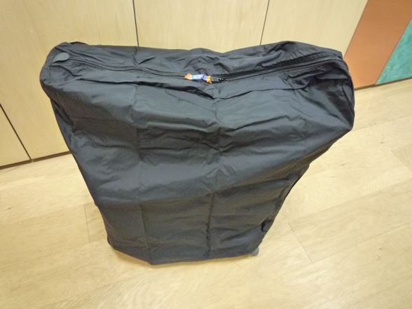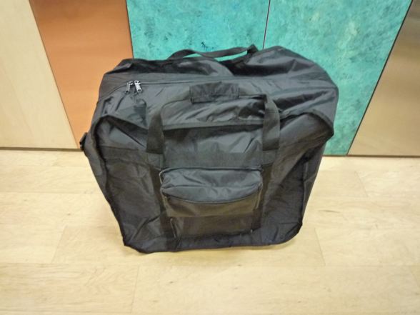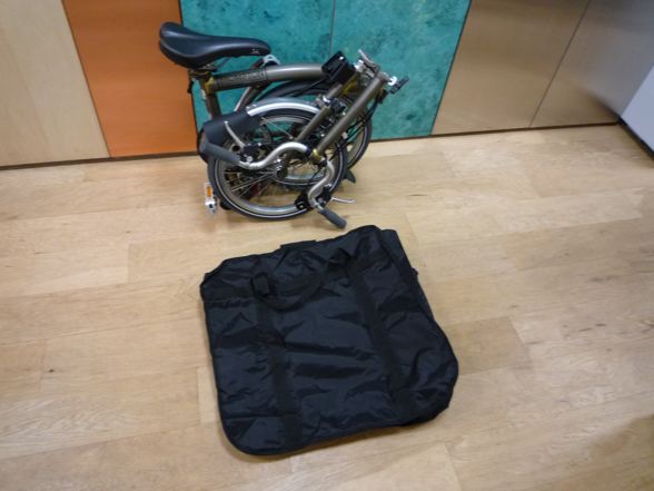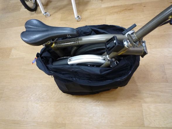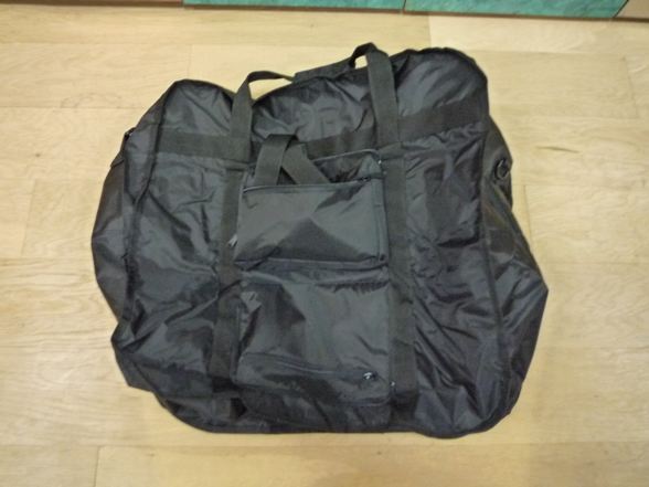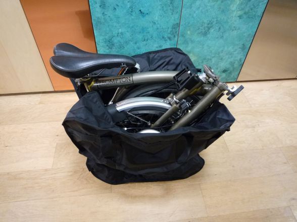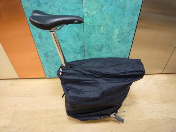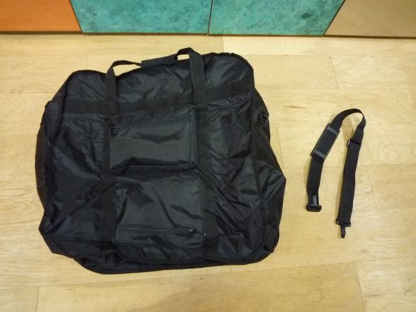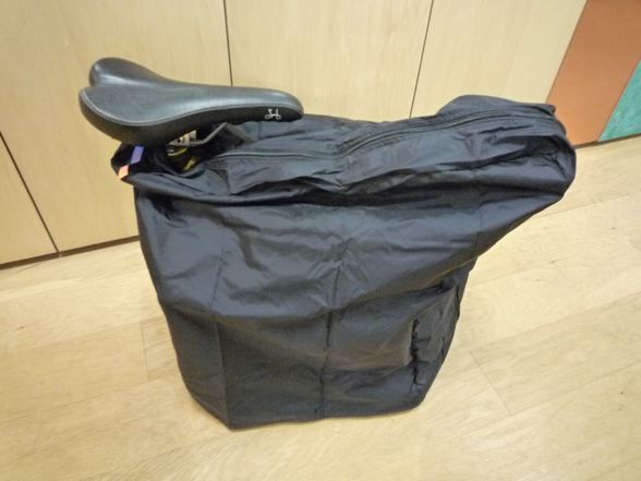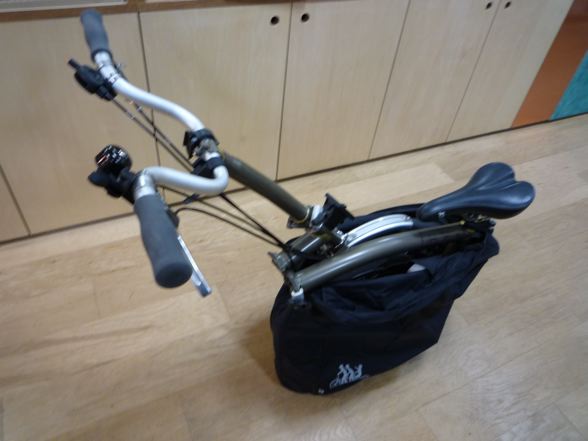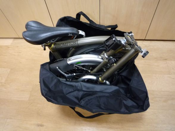 実際の使用感ですが、サイズや出し入れに関してはバッチリです。ただし、ゴワゴワしているので、小さく畳んでサドルにかけられる状態に圧縮するのがチョッと面倒です。電車の乗り降り回数が多いので、僕の場合はいちいち畳まずにガバッと折って、吉田かばんに突っ込んじゃいます。それと、純正品で結構高い割には耐久性に問題がありそうです。製品製造上のバラつきなのかもしれませんが、なんせ速攻でジッパーが壊れました。即交換。そして今回の年末年始輪行では、ショルダーをひっかけるタブが縫い目ごととれちゃいました。そしてブロ君は落下ですよ。ぬ〜!約12kgを担ぐ事自体にやはり無理があるのでしょうか?これは再びクレーム交換でしょう。袋に負担させるのは無理があるのかも。やはり本体フレームにショルダーを止めないとダメなんでしょうね。ごく普通の使い方で2回も破損はどうなんでしょうか?