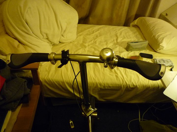 左が壊れたオリジナルベル。右がシンプルなアルミベル。少し重量UPか。
