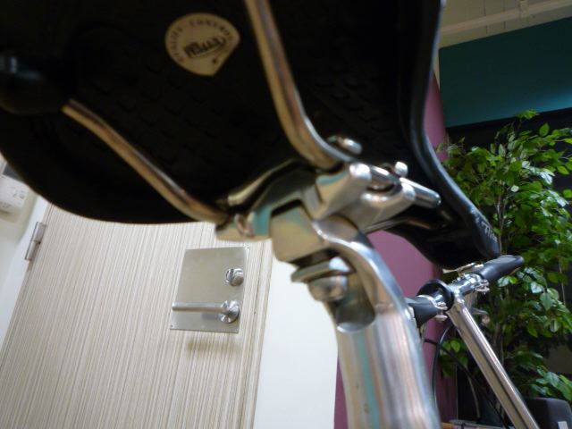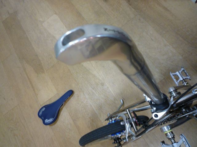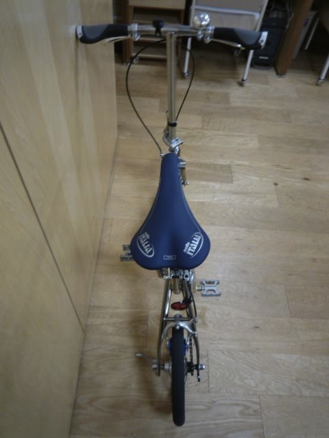 やっぱりBromptonはそのまま乗るかなぁ〜。このセライタ製らしいBrompton純正サドル、重さは340gもあるけどデザインも気に入ってるし、特にあの折りたたんだ時に「ここを持て」といってるグリップがいいもんなぁ〜。独特な純正パーツで構成されているちょっとレトロなBrompton。結局ペダルもそうだったけど