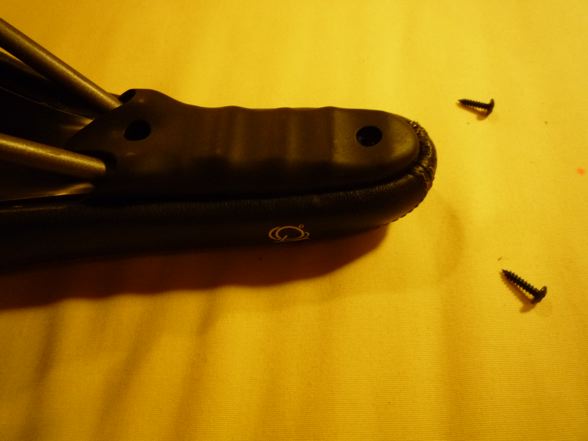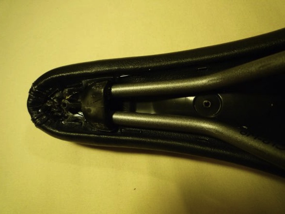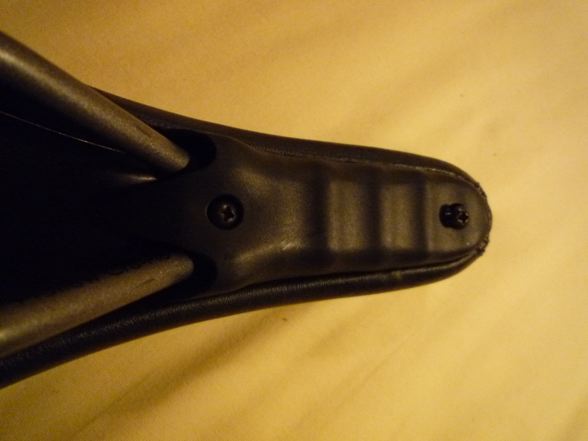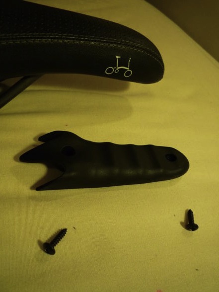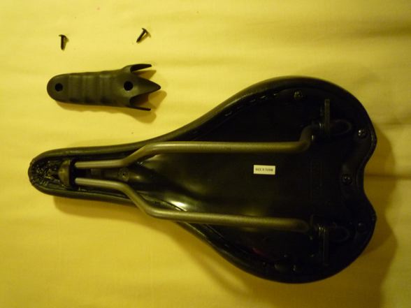の存在なのです。これがまた、ブロくんを畳んで持つ時には非常に重量バランスもよく、機能的なのです。裏返してみるとビスで止まっているだけ。サドル外形もレールの形もなんとなく似ているので早速改造してみることに。