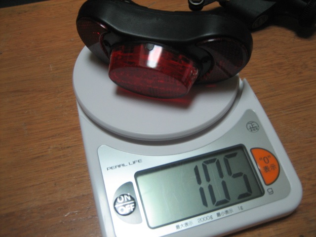 これに、単4電池の重さを足すと、アルカリ電池で12g×2 。最低でも105g+24g=129gって事になる!129gといえば、軽量サドル1個分ですよ!Knogさんのリアライトにすれば1/3に軽量化が可能なのだ!しかも純正品は常時点灯するだけなので、総合的には、軽量化に加え、明るさ、視認性、安全性、使い勝手を考えるとKnogさんの方がGOOD!昼間の走行時ははずしておけるから更に50gでフルにサドル1個分の軽量化なのだ!