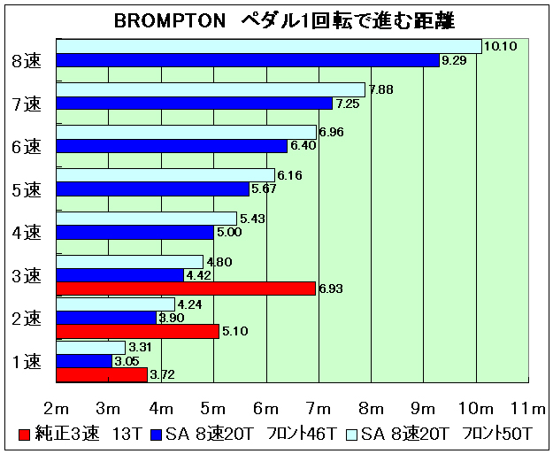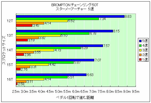 2つのシフターを合わせ持つ僕ちゃんのM6Lですが、Bromptonの4つのモデル中、すでに最もワイドな変速比になっており、2010年にはスターメーアーチャー製のBWR(ブロンプトンワイドレンジハブ)が搭載され、ギア比302%のワイドレンジを実現している。従来モデルはスラム社製の6段ギアを搭載しており、ギア比は215%だったので格段の進歩を遂げている。しかし唯一の欠点をあげると中高速域である4速から6速のギアの幅が大きいという点。ブロンプトンをロングツーリングで使う場合は、この中高速域の充実の差が疲労度に影響。この問題を解決するのが、BWRハブをSRF5に交換し、純正外装2段と合体させて10段化にするという方法。SRF5組込み時に14T&16Tのリアスプロケットに変更するとクロスしているギアが全て無くなり10段ギアのバランスがとても良くなる。このカスタマイズで、峠道を快適に上れるようになる低速域から、ロングツーリングで疲れにくい中高速域まで、中味の詰まったツーリングバイクのようなギア構成になる。