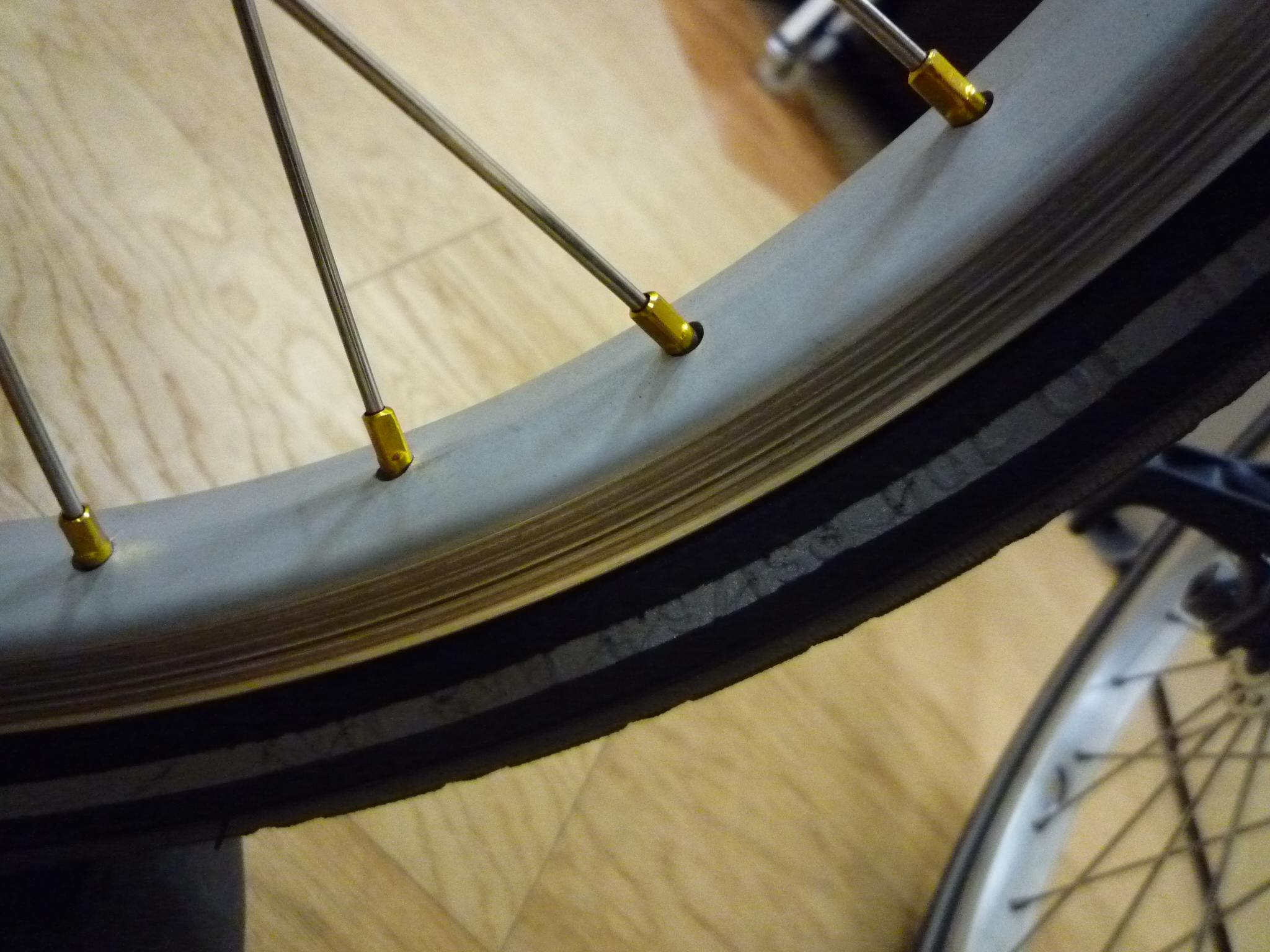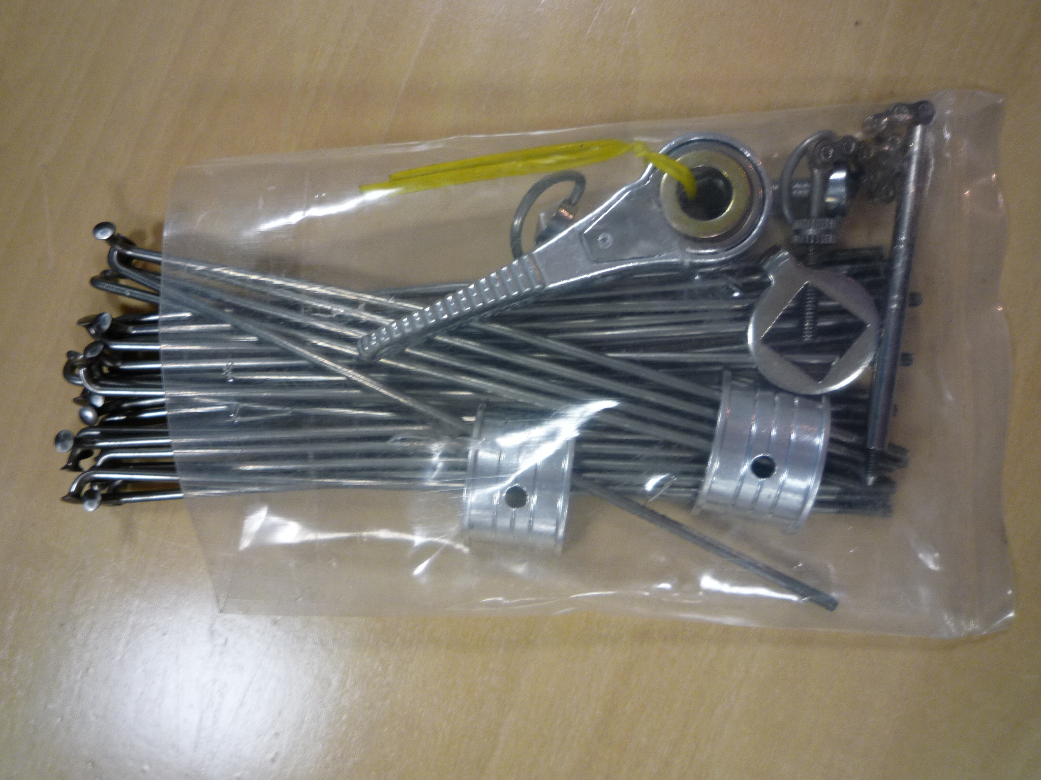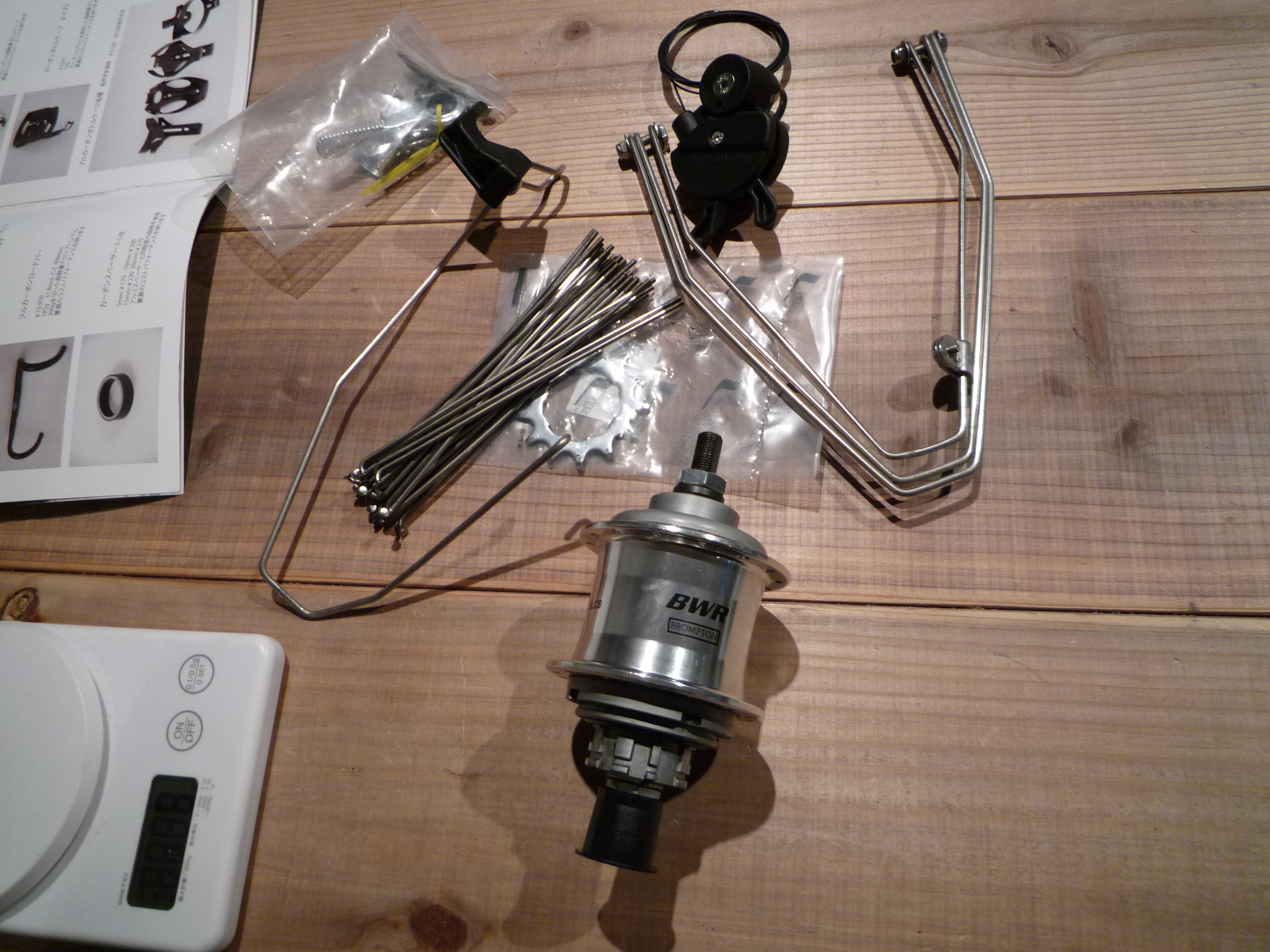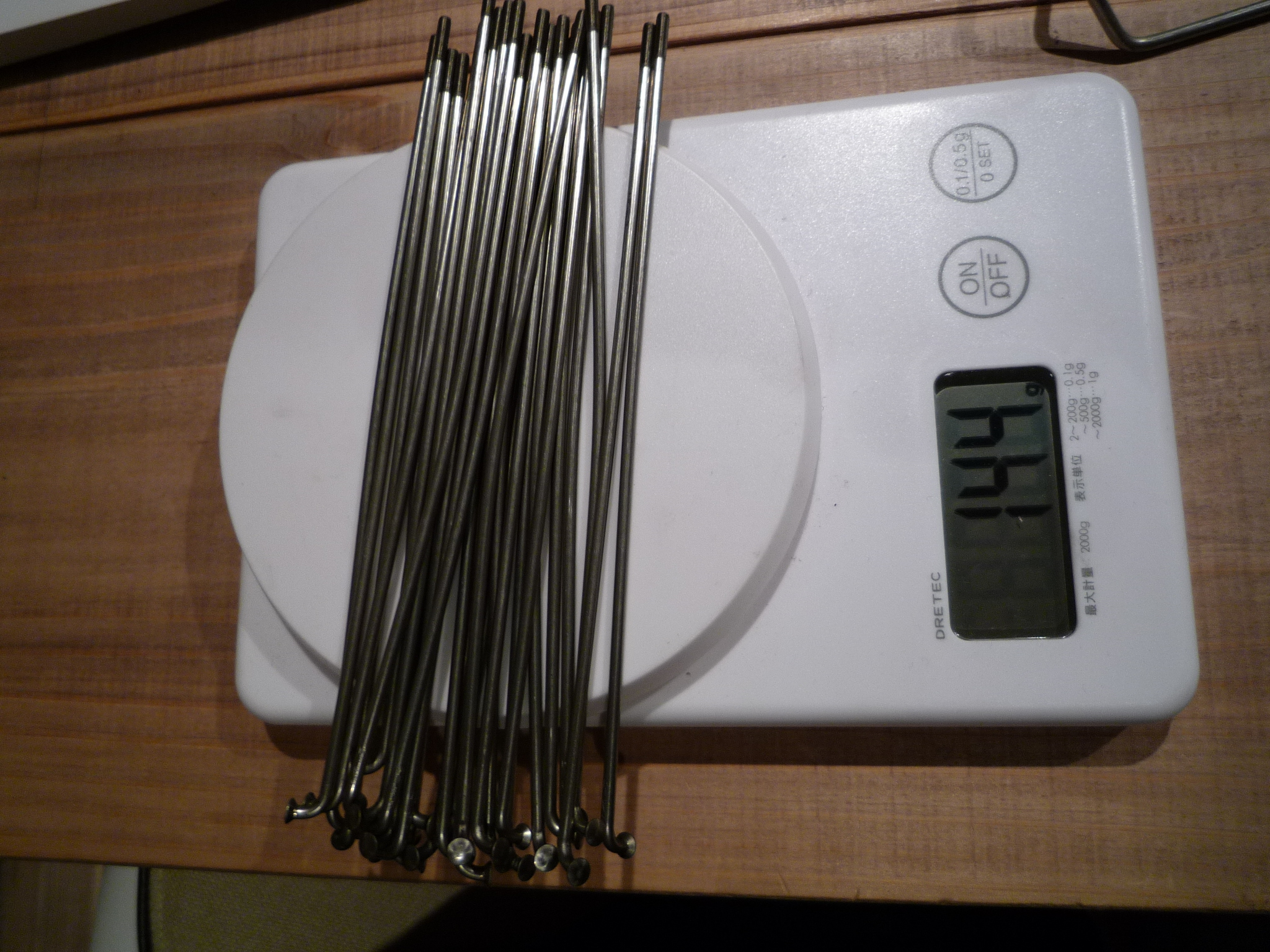 はずしたステンレススポーク。重さを計ったらスポークって結構重いんですね。束ねるとタイヤ一個分で144gもある!って事は前後で軽量サドル2個分!しぶやさんいわく「チタンにすれば半分になりますよ」との誘惑。ぬ〜