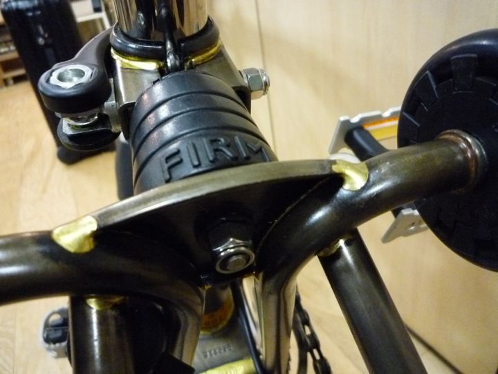下から入れて、透明のビニールテープでがっちりつけます。シートポストをあげた時にスムーズにスパンと決めるには、でっぱり周辺のビニールテープの巻き方に微妙なコツが必要だとゆ〜事がわかってまいりました。一日最低4回は折りたたむので、どのみち3ヶ月後位にはまたはずれちゃうかもです。