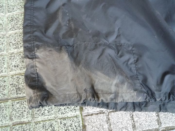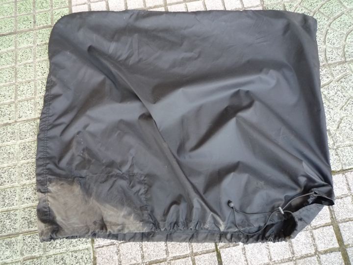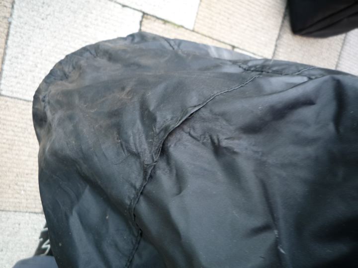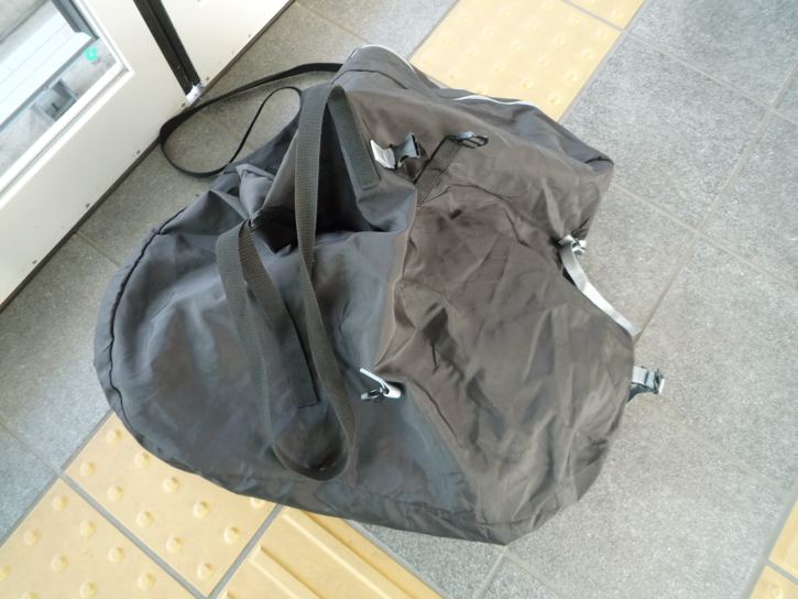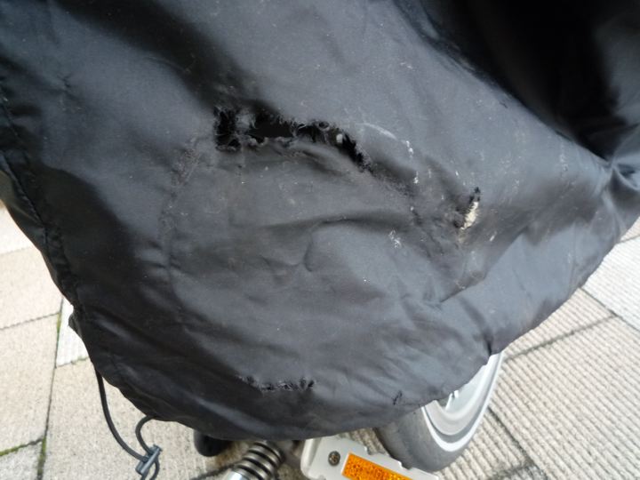 どうやら、転がしている時に路面に擦ってるみたいです。使い方が悪いのか?薄すぎるのか?どちらにせよ、たった2回の輪行で穴があいてしまいました。ぬ〜