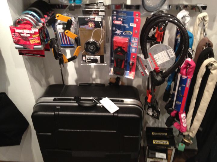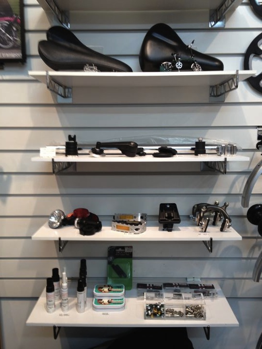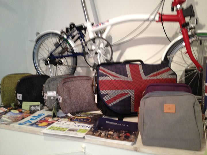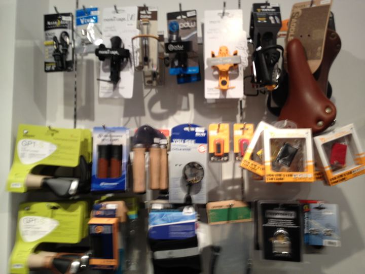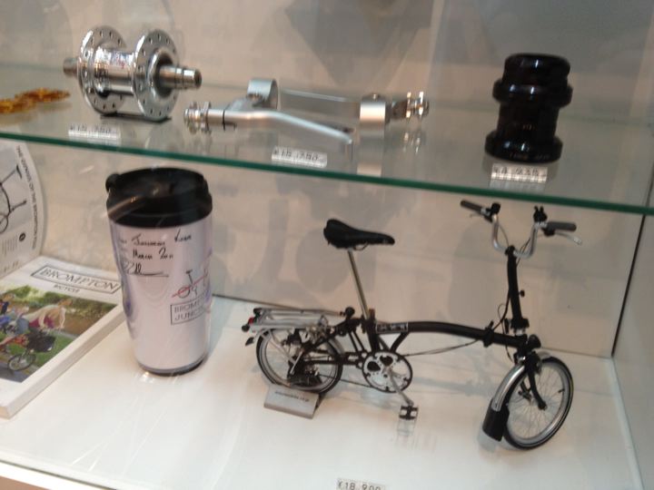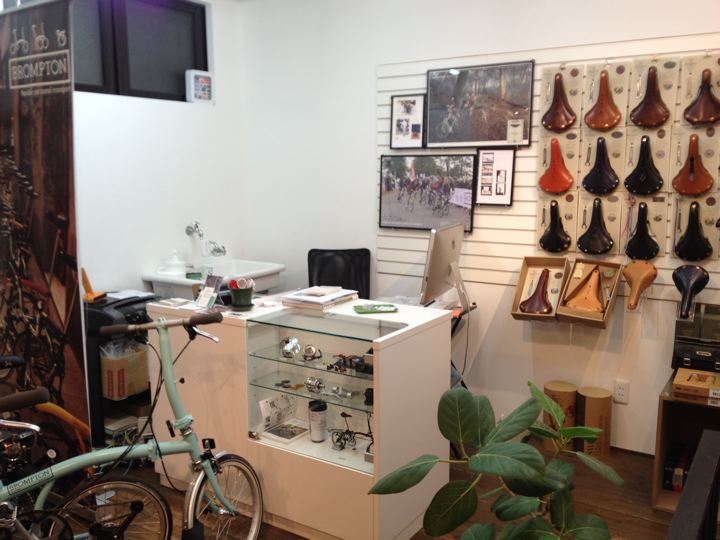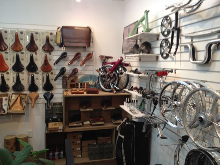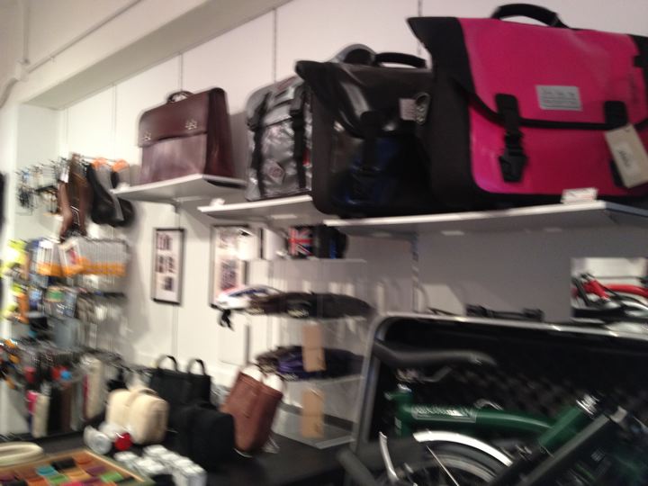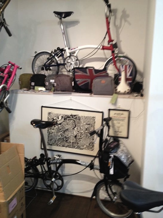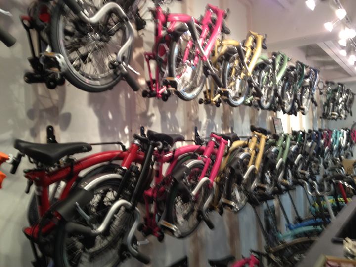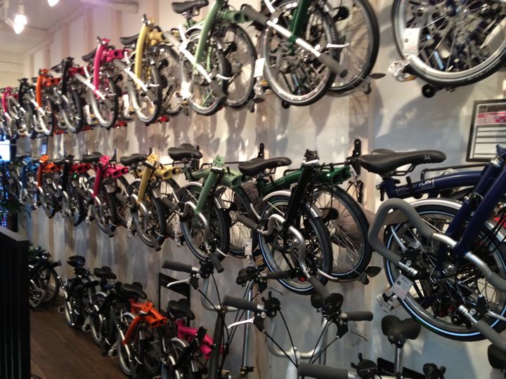間口は狭くても奥に長が〜いお店です。壁面は折りたたんだBromptonの大行列!