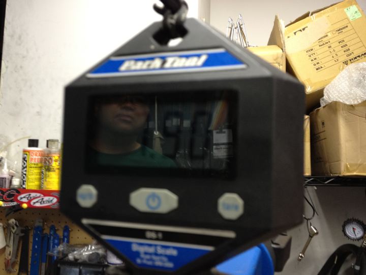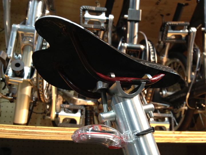 どうやらこのサドルとシートポストが一番の減量ポイントらしい。確かにペンタクリップ(やぐら)は、美しいパーツですが、ちと、重たいんです。それを使わないという事なんですね。むむむ。その他ボルト類をチタンに交換されていました。更にシートポストをこの方の高さギリギリまでカットされていました!余長は1センチたらず。ちょっと上げすぎるとすぐ抜けてしまいます!本体を持ち上げてみると確かに超軽かったです!凄い!凄過ぎます!上には上がいるもんですね。イヒヒ