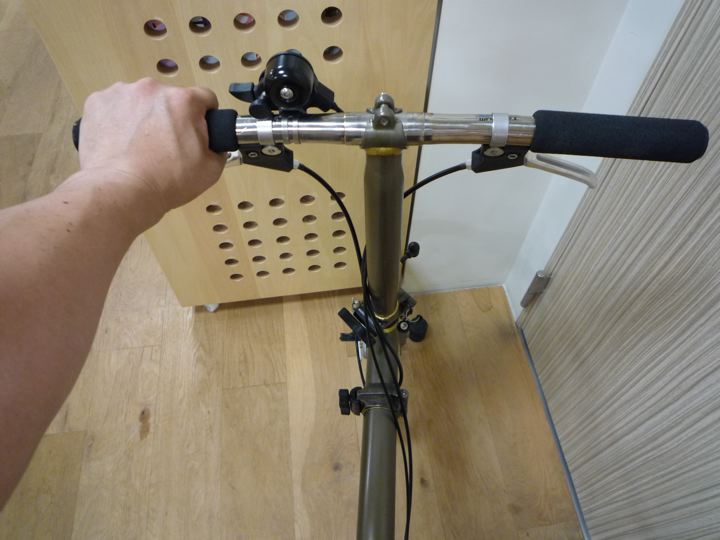 長過ぎたハンドルのバランス改善!自分の肩幅ピッタリにカットする事によりジャストフィットで更なるブロくんとの一体化に成功!折りたたんだ時の見た目のバランスも黄金比に!