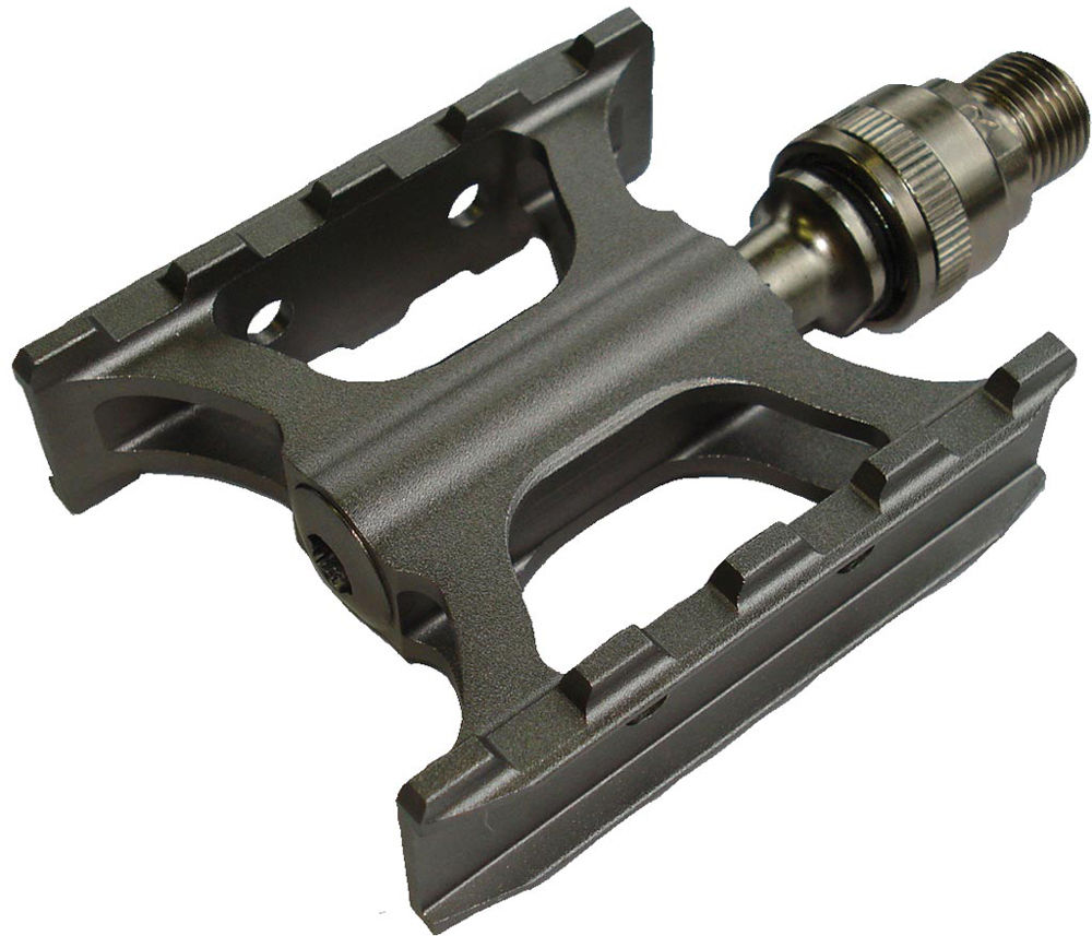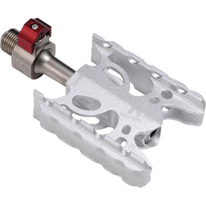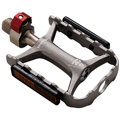 工具無しで脱着できるペダル。他のウェルゴQRDシステムのペダルと差し替えて使用できます。wellgoの新しい着脱システム、QRD(Quick Release Device)方式。赤いノブを引き上げることで、ワンタッチでペダルを外すことが可能。装着する際は、そのまま押し込むだけ。取り付けは、8mmの六角レンチか、21mmのスパナにて。赤いノブの付いたアダプターはクランクに対して位置が固定されるが、付属のスペーサーの入れ方を調整することで、ある程度赤いノブの装着角度を考慮することが可能。クランクの先端方向に飛び出る角度に装着することで、ノブの操作を容易にすることも可能。外したペダルを収納するためのポーチが付属。シールド・ベアリング。リフレクターが装備されているが、外すことも可能。