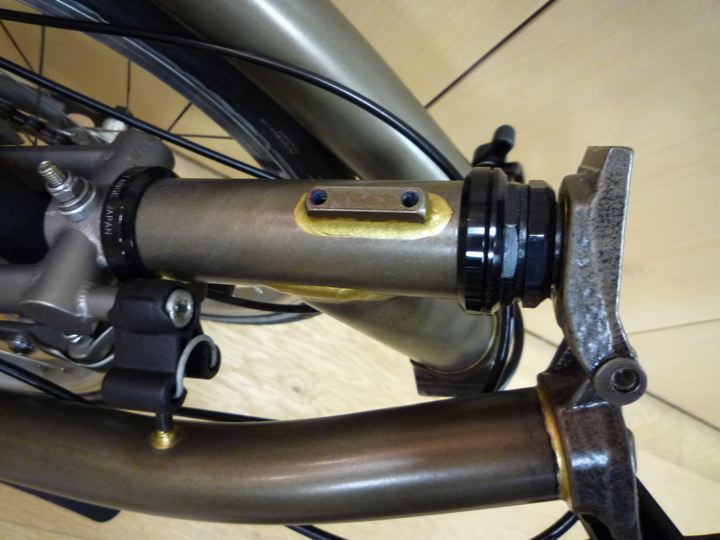 フロントキャリアブロックとは、純正Bagなどを固定するこんなパーツ。日常の足になっているS2L-Xではほとんど使わない事が判明。Brompton Front Carrier Block & Clip Assembly - QFCBA とる。