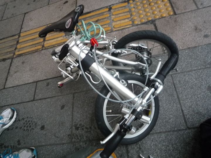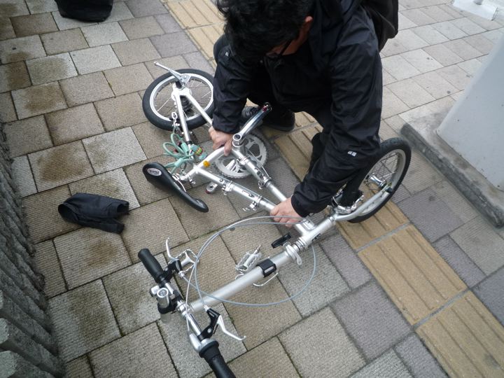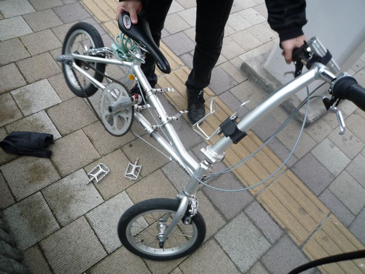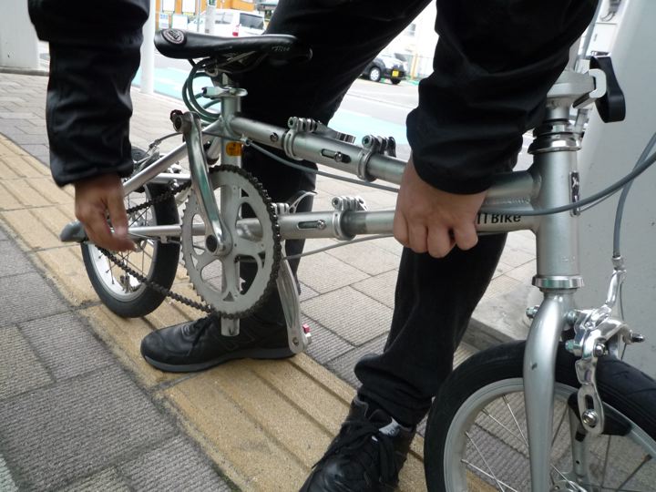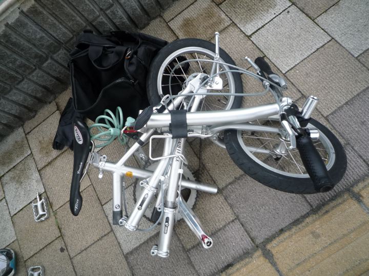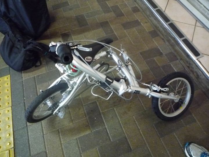 なぁ〜んだ、インロー部分をスライドすればいいのか。あっさり解決。なんとか畳めて輪行モードへ。