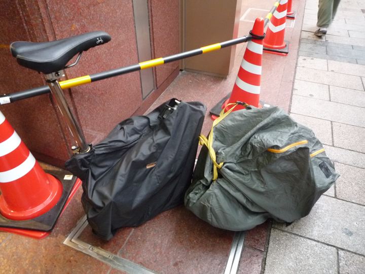 それぞれの輪行袋と輪行カバーから出していたら、いきなり雨が!それでも強行突破!
