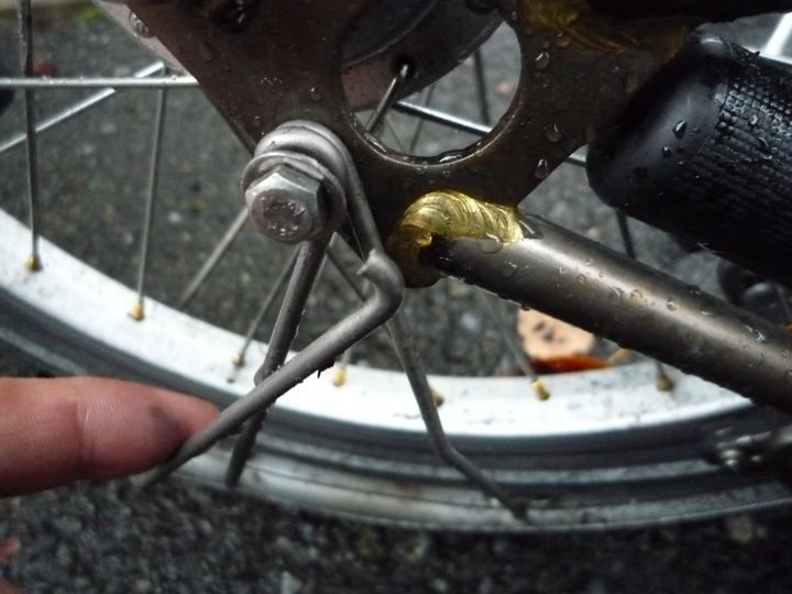 そしたらなんとぉ〜っ!ブロくんS2L-Xから移植した泥除けのチタンステーが1本折れてる!ぬ〜っ!意外ともろいんですね。とほほ