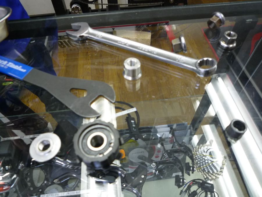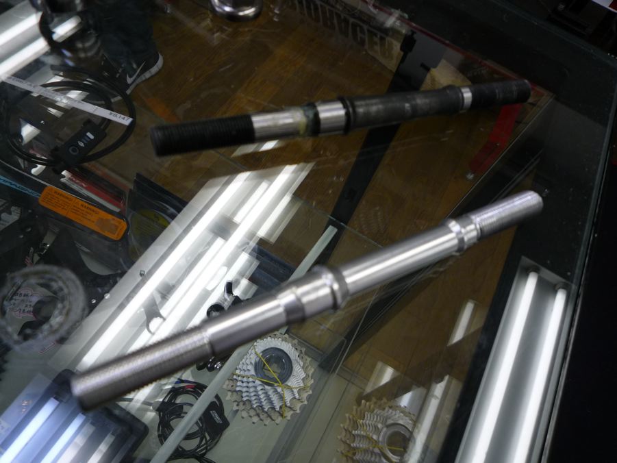いとも簡単に外せたのでした!さすがプロです。手品みたいでした。な〜んだ、片側をダブルナットにして固めればいいのか!なるほどぉ。万力で締めてシャフトを固定するイメージしか出来なかった自分が、おばかさんなのでした。イヒヒ