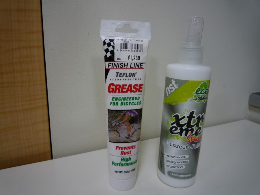 お代もいらないとゆ〜太っ腹!あまりに申し訳なかったので、おフランス製のグリスとワックスをメンテナンス用に購入。どのみち必要だと思っていたのでOK。やっぱり、こ〜ゆ〜時は、年中無休で営業時間長いと助かるなぁ〜。喜び勇んで一目散に、バラバラ事件のブロくんのもとへ。
