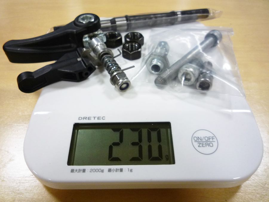 はずした純正パーツは全部で230gなのでした。そういえば、ピーターさんのパーツ全部まとめて計るの忘れてたぞなもし〜(計算上は、全部で108gだから、-122gの減量って事ですね。イヒヒ)