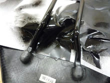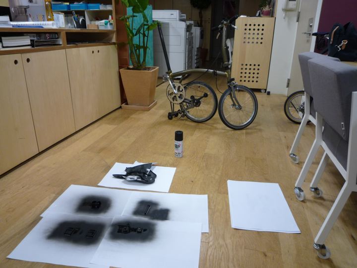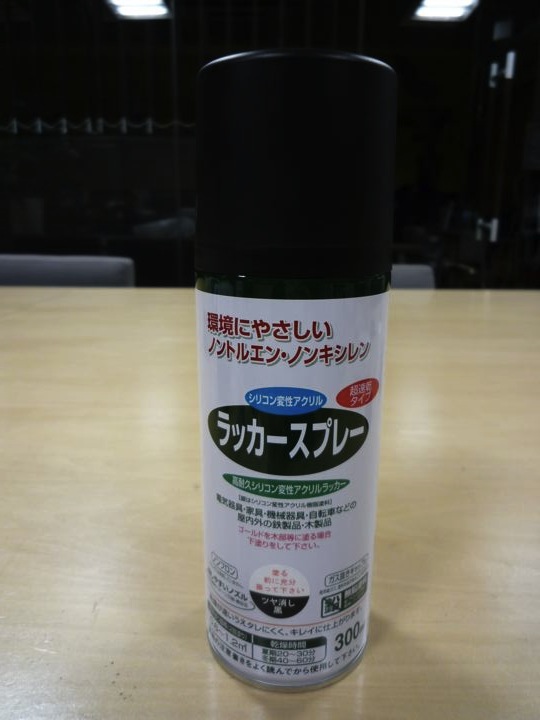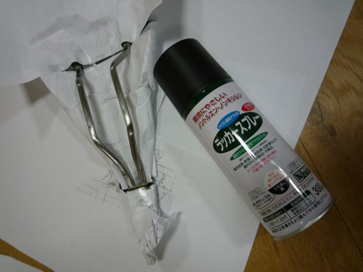 キコキコさんのブログの方法だとよさそうなのでしたが、思い立ったらすぐやりたい派なので、東急ハンズ銀座店さんまでブロくんで、ひとっ走り。ここは、たとえ剥がれてもいいから、男らしく、内装屋らしく、普通のラッカー塗装(艶消しブラック)でいく事に。2液性のポリウレタン塗装もあったのですが、高いし、2液だから使い切りでもったいないから断念。