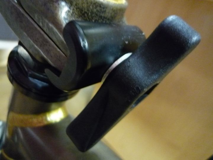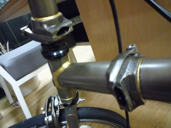 って、僕ちゃんがそれを忘れる訳ないでしょ!メインフレームとハンドルステムの2カ所ある折りたたみ部分のヒンジクランプ。すでに純正品から加茂屋さんのジュラルミン削り出しの黒に交換済み。
