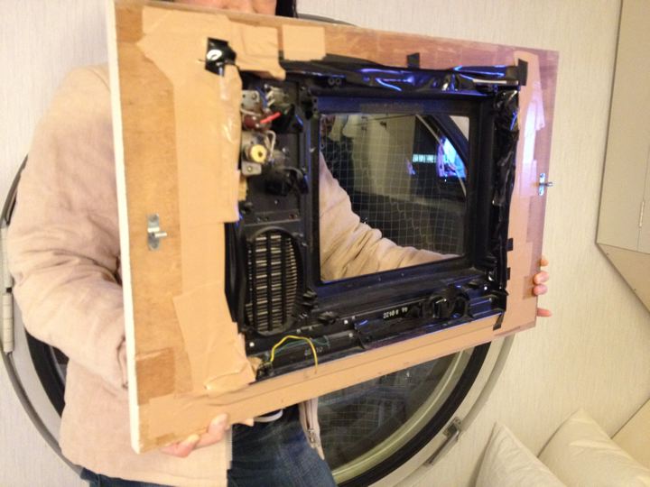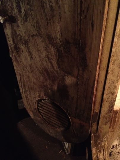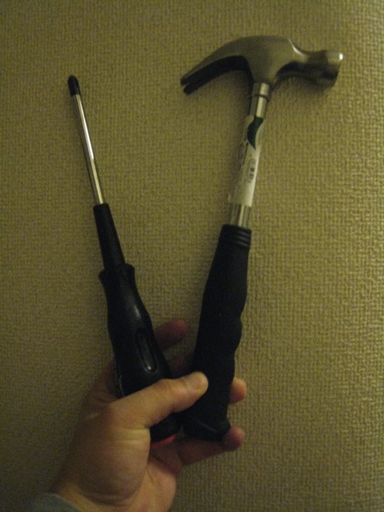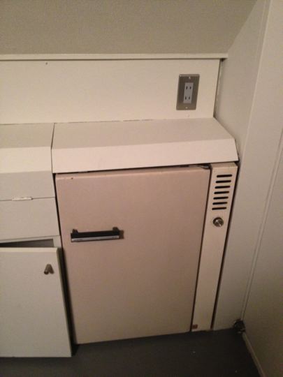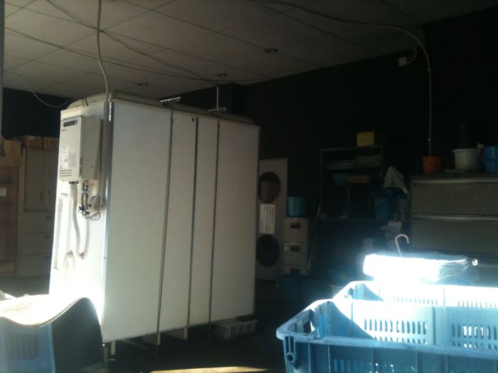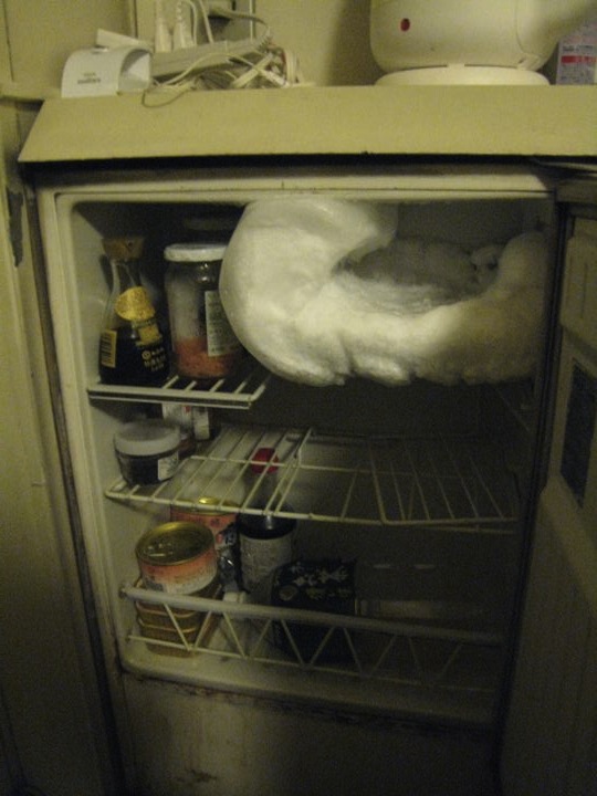 トラブル4。特注極薄冷蔵庫の霜が大変な事に。ドライバーと金槌で対応。その後、何度目かの霜取り作業をしているうちに、手が滑って冷媒管を「ぶすっ」を刺してしまい「ぷしゅ〜」で使えなくなる。