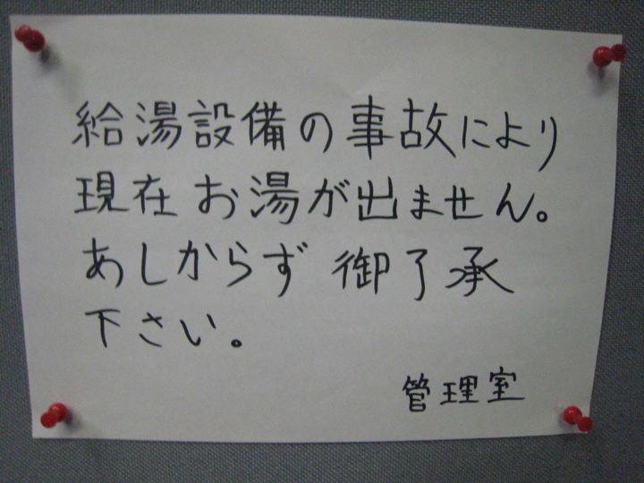 トラブル6。ついに全館給湯が停止。「あしからず」って言われてもお風呂に入れないのは困っちゃうじゃないの!最寄りの江戸時代からやってる銭湯で対応。もはやこれまでか?と思ったが、その後シャワーブースが設置されました。1回しか使ってませんが・・・。