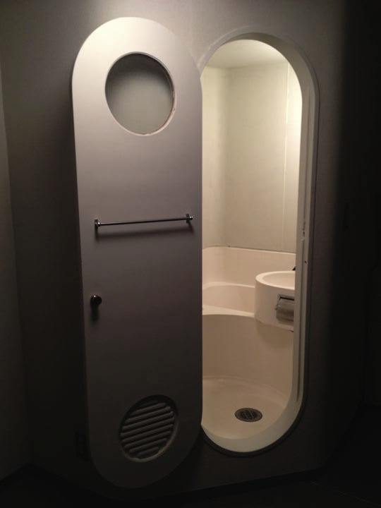 かつてず〜っと置いてあった今は美術館行きになってしまったモデルカプセルと現在も使われている駐車場にドンと置いてあるシャワーブース。