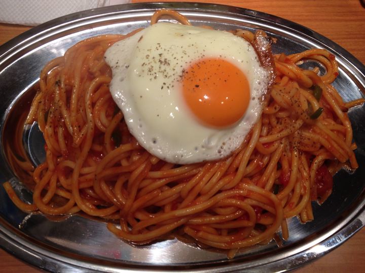 ナポリタン大盛りの目玉焼き付き。粉チーズとタバスコいっぱいかけて、う、うみゃ〜!