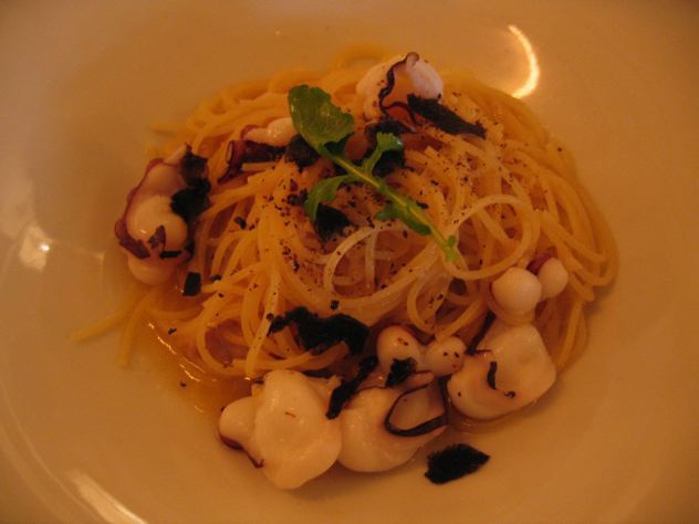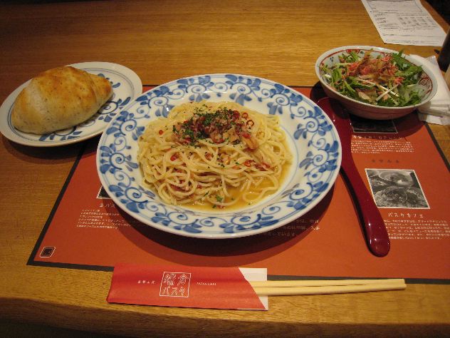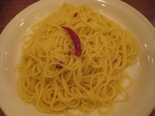 ペペロンチーノです。基本です。だいたい一番安いですが、そのお店の実力が判定出来ます。最近は生パスタがブームですが、もちもちしていて美味しいです。
